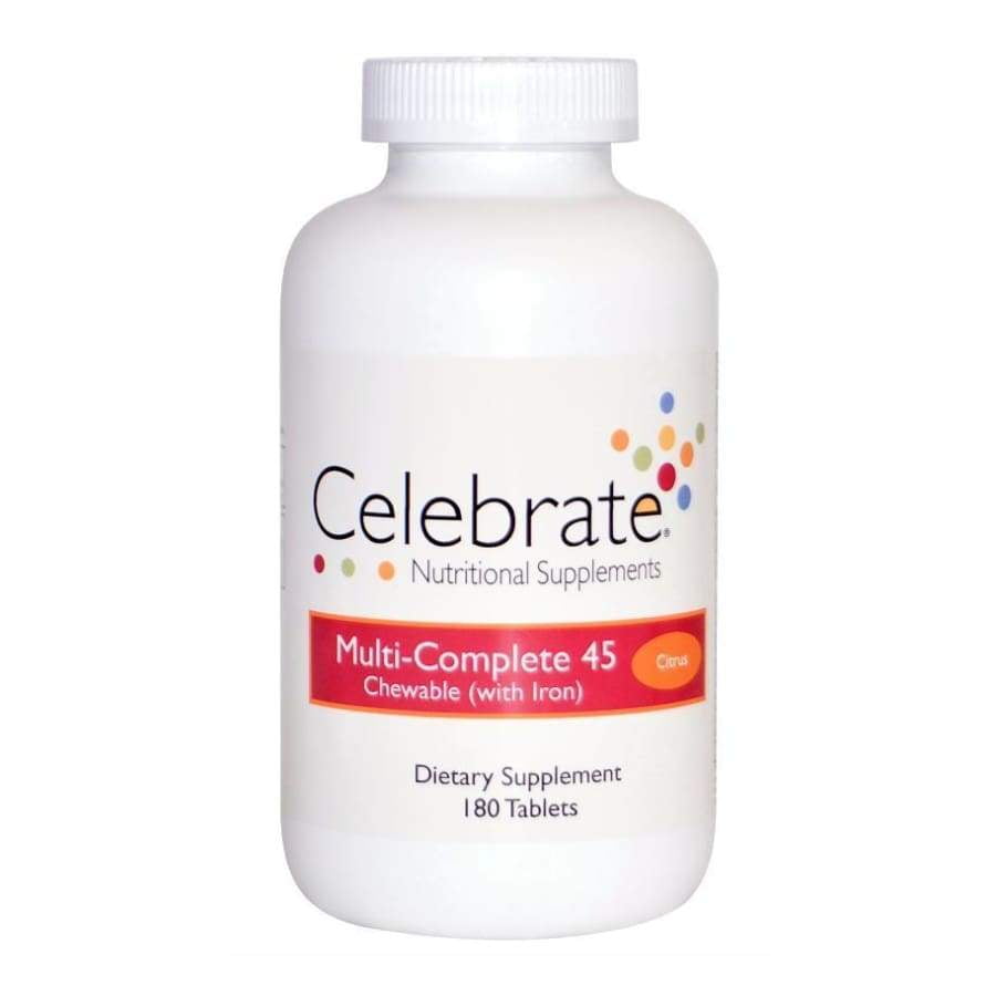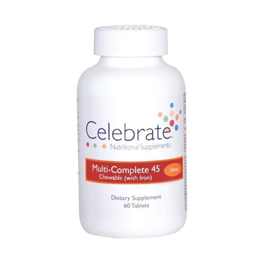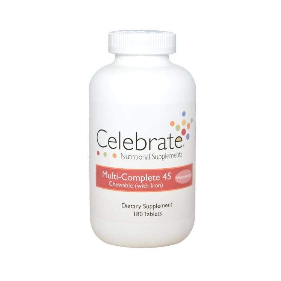 Celebrates Multi-Complete 45 contains all of the vitamins and minerals that are inCelebrates original Multivitamin formula PLUS 45 mg of iron per daily serving and an increased level of vitamin B-12 (1000 mcg/day). This product is perfect for those patients who need extra iron and may be looking to avoid taking a separate iron supplement. It is important to keep in mind that this product may NOT be taken at the same time as calcium to prevent absorption interference. This integrated formula provides maximum bioavailability asCelebratehas carefully selected each vitamin and mineral level and form to enhance interaction and absorption.Key Elements:45 mg of iron3000 IU of vitamin D31000 mcg of vitamin B-12Key Things to Look for in Celebrates Multi-Complete 45:Taste – When you have to take a product every day it needs to be something that you like. Celebrates Multi-Complete 45 is unbeatable with a smooth texture (no grit) and great taste making it easy to maintain your compliance with your supplement regimen. Celebrates Watermelon flavored chewable is a unique watermelon flavor with a slightly tangy twist that makes this a delicious option!Vitamin B-12 (as methylcobalamin & cyanocobalamin) – With over 16000% of the daily value (DV) of vitamin B-12 Celebrates Multi-Complete 45 contains one of the highest studied levels of B-12 for weight loss surgery patients. Studies have shown that at these levels 95% of patients will NOT need additional sublingual B-12.Vitamin D3 (cholecalciferol) -Celebrates multivitamin contains the highest level of vitamin D available in a bariatric product. Vitamin D deficiencies are quite common in bariatric surgery patients so taking a multivitamin with adequate levels of vitamin D3 is critical to your health.B-Complex – In addition to vitamin B-12 the other B-complex vitamins are critical for your health following surgery. Certain B vitamins such as vitamin B1 (thiamin) are critical immediately following surgery and Celebrates Multi-Complete 45 contains the most appropriate levels of each vitamin in the proper form for bariatric surgery patients reducing the need for an extra B-complex supplement.Vitamin A – By blending pre-formed (retinyl palmitate) and beta-carotene to make up our vitamin A Celebrate is providing the safest and most effective approach available for this key vitamin. This blend allows your body to regulate its intake of vitamin A absorbing only what it needs to function properly.Magnesium This critical mineral is most effective in the citrate form. Celebrate contains the highest percentage of magnesium citrate of any bariatric supplement.Chelated Minerals – Chelation simply means "attaching to." By chelating our mineral forms to an amino acid Celebrate has increased the likelihood that these minerals will be absorbed in a low acid environment.Water Miscible Vitamins ADEK -Celebrate utilizes dry water miscible forms of vitamins A D E and K to further enhance absorption. This means that these nutrients do not have to be taken with fat to optimize absorption unlike other fat-soluble vitamins included in many multivitamins.Great for Sleeve Gastrectomy Gastric Bypass and other weight loss surgery patientsDaily Dosage: 2 chewablesFlavor:Watermelon