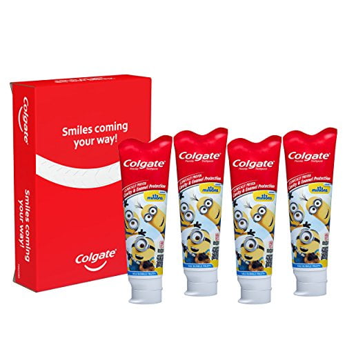 Colgate Kids toothpaste with Anticavity Fluoride, Minions, contains an enamel safe formula clinically proven to fight cavities. This formula strengthens and protects developing teeth as it is designed for kids ages 2 and up. With a mild bubble fruit flavor, this sugar Free Colgate Kids toothpaste is designed with fun Minions characters on a convenient stand-up tube with flip-top cap that encourages kids to brush.