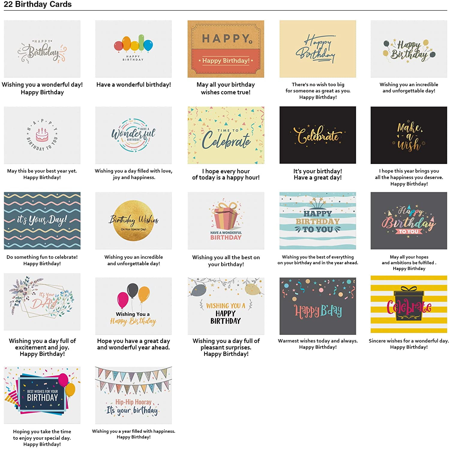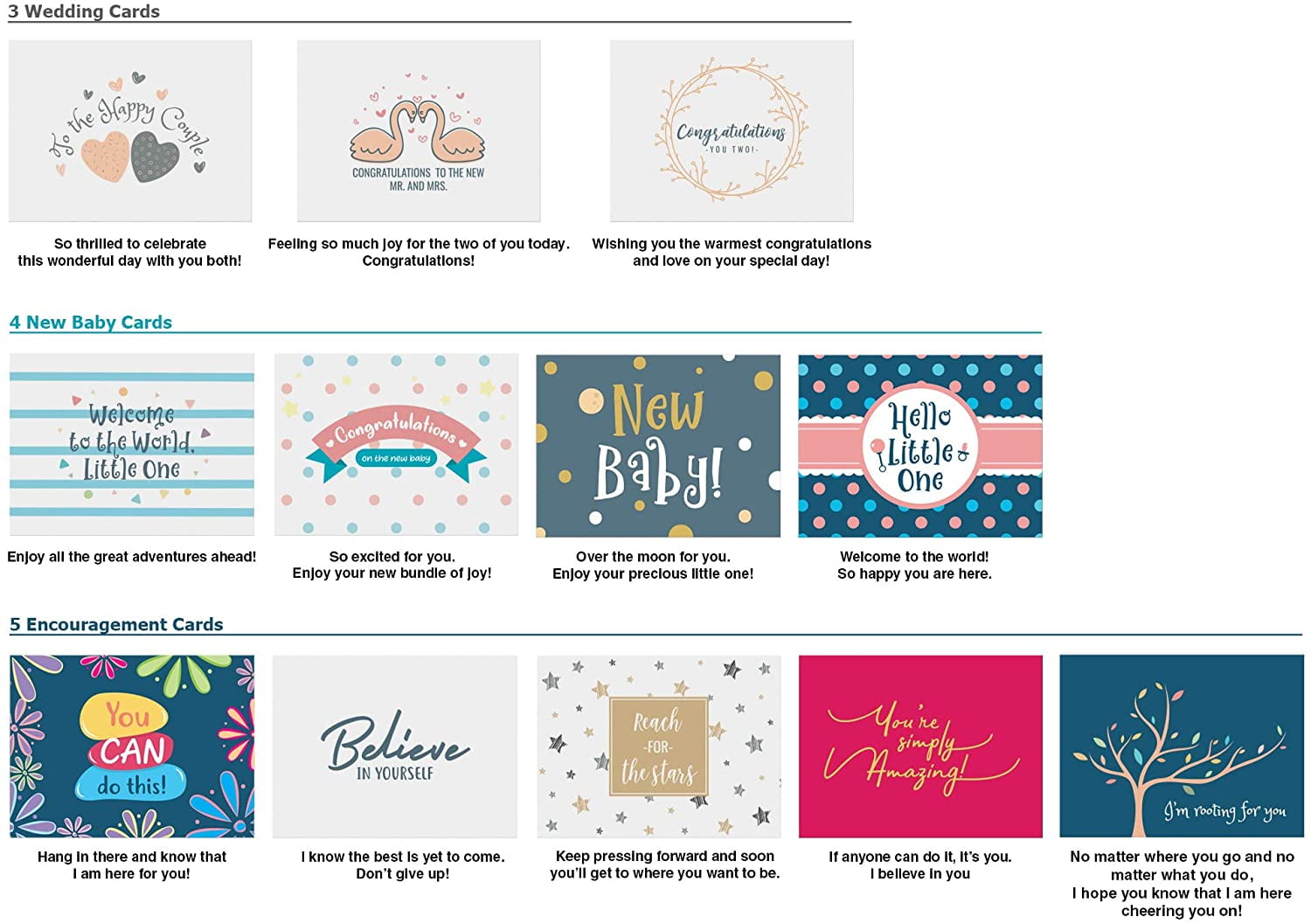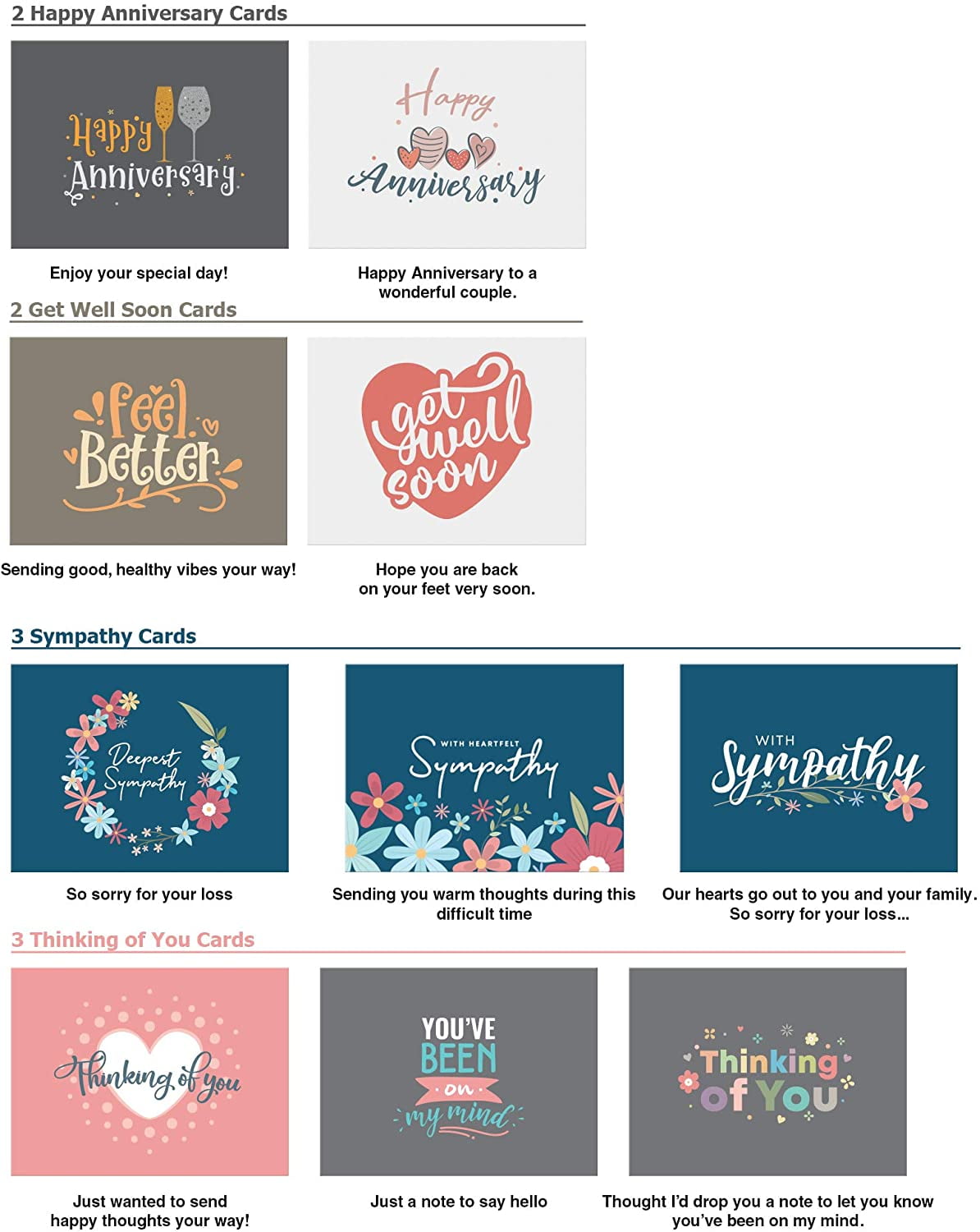 - ✨SAVE TIME – 60 UNIQUE CARDS FOR ALL OCCASIONS: 2 Get Well Soon, 2 Happy Anniversary, 3 Sympathy, 3 Thinking of You, 3 Wedding, 4 New Baby, 5 Encouragement, 6 Congratulations, 10 Thank You and 22 Happy Birthday Cards – perfect for when that occasion sneaks up on you and you just don’t have the time or desire to go out and shop.