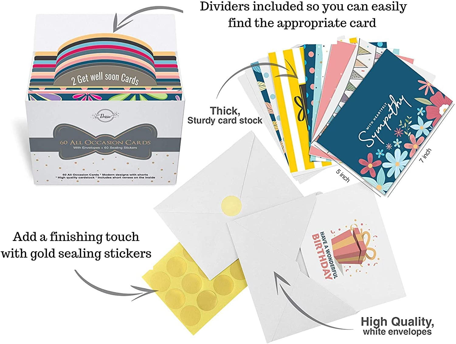 - ✨STAY ORGANIZED – STORAGE BOX WITH GREETING CARDS ORGANIZER: Our assorted greeting cards for all occasions are thoughtfully packaged in a storage box, making it incredibly easy to store unused greeting cards in perfect condition. Even then, we know 60 assorted cards are a lot in one greeting card box set! That’s why we’ve also included divider tabs – no more hunting through a cardboard box to find the perfect card.