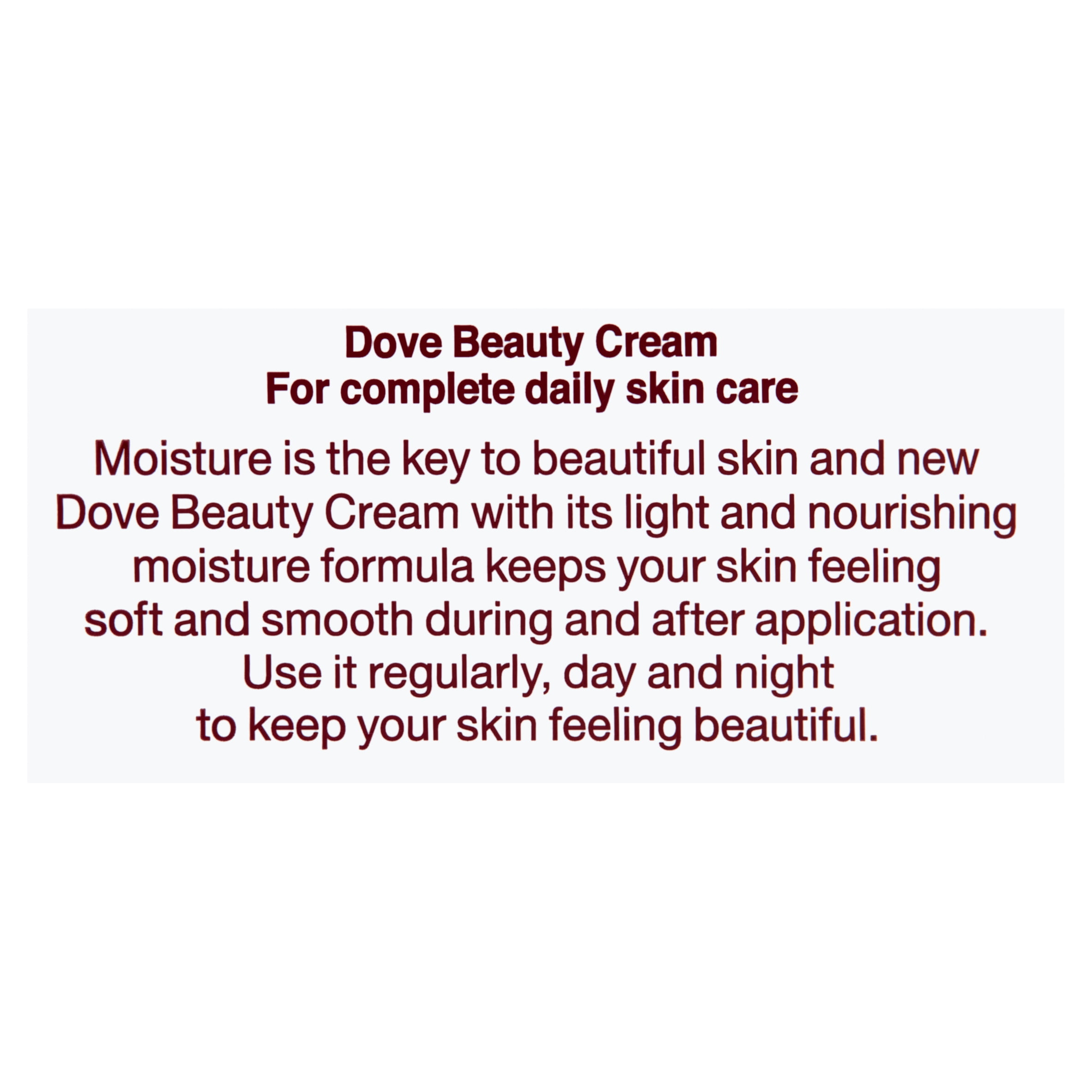 Moisture is the key to beautiful skin and new Dove Beauty Cream with its light and nourishing moisture formula keeps your skin feeling soft and smooth during and after application.For complete daily skin care