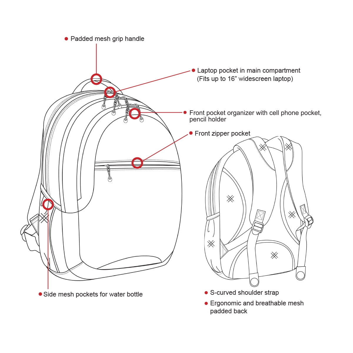 The air lift back panel of the backpack is padded yet breathable to provide you with a comfortable and ergonomic experience. The back straps are padded and breathable just like the back mesh panel. Luggage strap provides secure and easy of carrying for the active traveler. The bag features durable a top handle perfect for travelling.