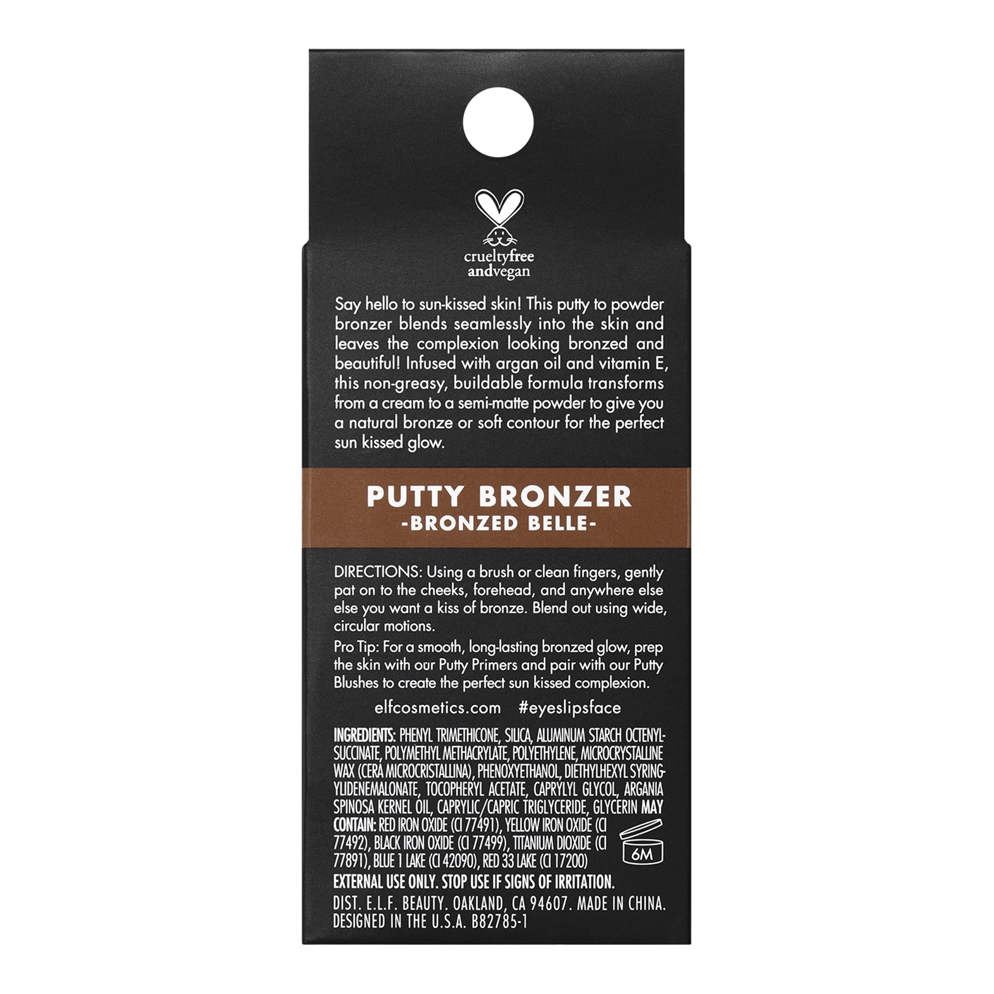Bask in that sun-kissed, back-from-vacation glow all year round. This unique creamy putty-to-powder bronzer effortlessly blends and blurs into skin, delivering a natural bronzing effect with a smooth, semi-matte finish. e.l.f.’s Putty Bronzer is lightweight, non-greasy, and packed with pigment, letting you build an all-over warm complexion or just a kiss of golden hour contour. Plus, the formula is infused with Argan Oil and Vitamin E for moisturizing, nourishing, and skin-loving benefits while you glow.