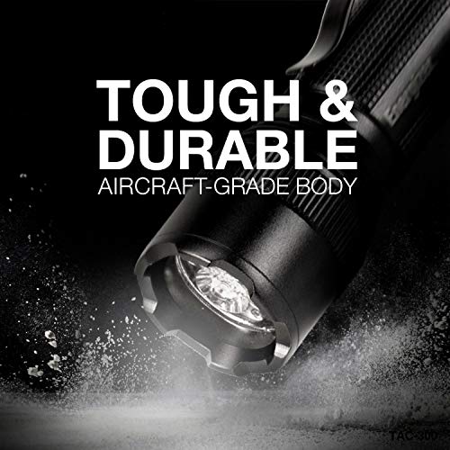 Powerful brightness fits perfectly in your hand with the energizer TAC 300 LED tactical flashlight. This compact, lightweight flashlight is built to take a tumble and shine on with an aircraft-grade aluminium body and is impact-resistant up to 1 meter. This LED flashlight delivers a beam of 300 lumens on high. This tactical LED flashlight offers the brightness and dependability that you need for DIY projects, camping, outdoor activities, and emergencies. Adjust the beam with three modes: High, low and strobe for emergency situations. A rear push button allows you to easily change the mode while holding the light, and a clip secures to your pocket, tool bag or briefcase for easy access. A long-lasting lithium battery provides the run time you depend on. Trust energizer to come through with the powerful beam and durable construction you need from a handheld LED flashlight.