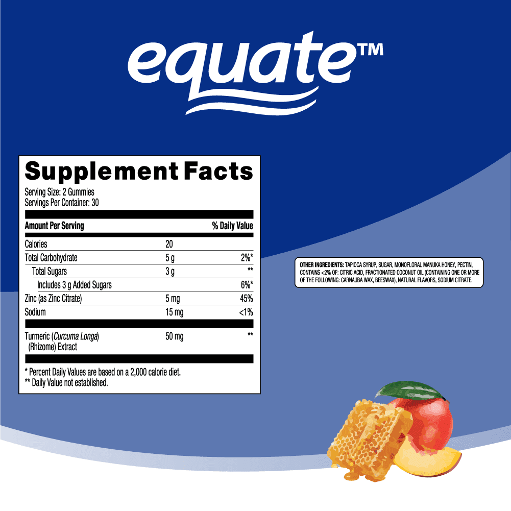 Equate Vegetarian Manuka Honey Gummies, 60 Ct and contain 50 mg of turmeric. These gummies are specifically formulated as a dietary supplement to support your immune system.