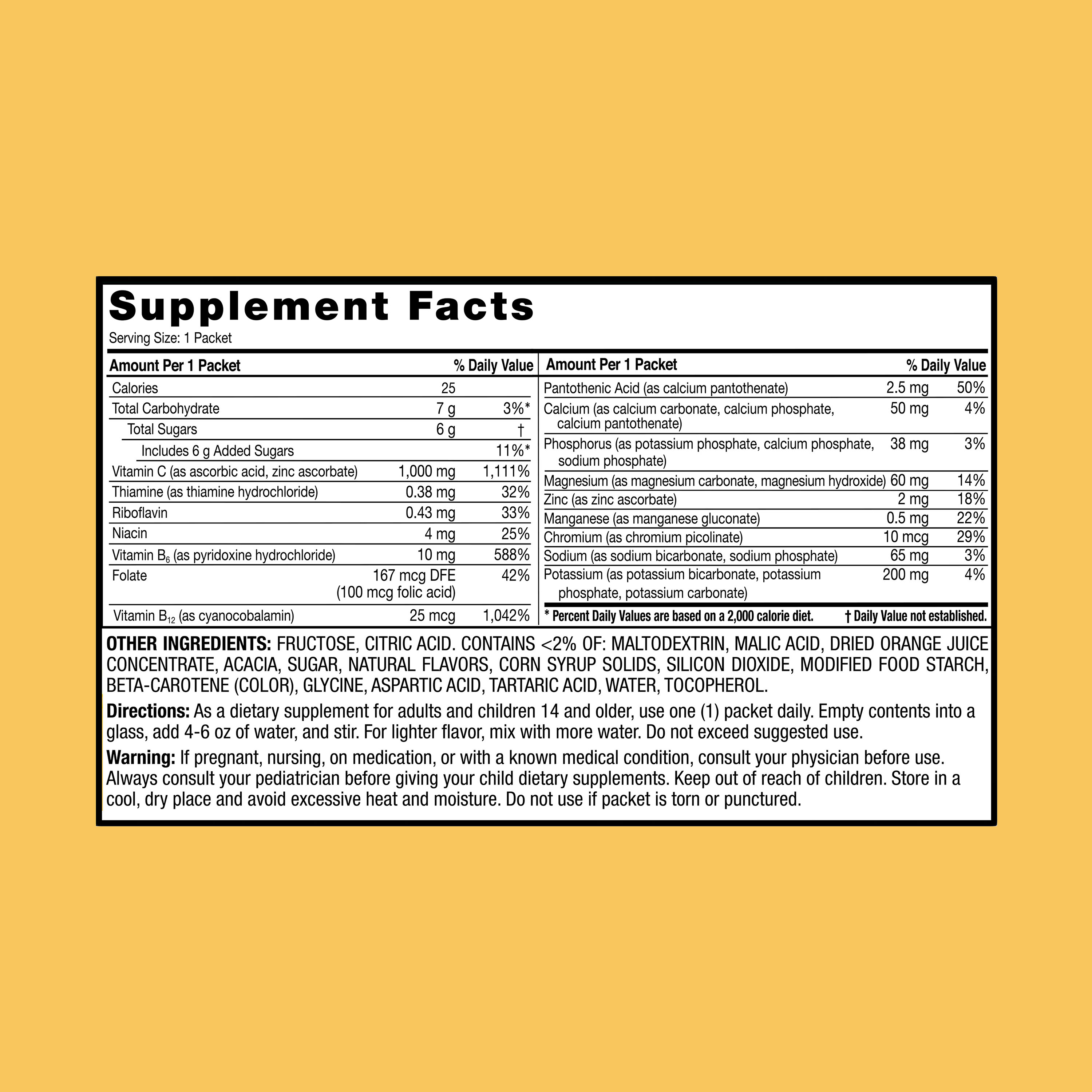 Equate Vitamin C Drink Mix Supplement for Immune Support is a combination of essential nutrients in a delicious formula that refreshes and nourishes. Using it helps to replenish fluids and electrolytes, calcium, magnesium, sodium and potassium lost through perspiration. This pack includes 30 individual packets, and each packet is loaded with 1000 mg of vitamin C, B6, B12 and zinc, which all aid in maintaining and supporting your immune system. This mix is made with natural ingredients and contains no artificial sweeteners. Plus, it’s caffeine-free! Equate Vitamin C Drink Mix Supplement for Immune Support is a great way to support and encourage every day wellness.