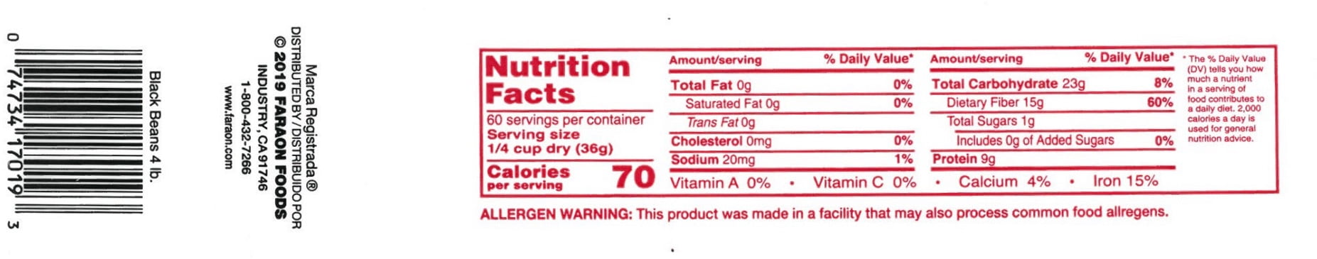 Faraon Black Beans, packed in a 4LB cello bag, are carefully selected from the best crops available. Faraon Black Beans are grown and harvested in the USA! Faraon Black Beans offer a true black bean color and authentic black bean taste. Faraon Black Beans are heart-healthy, 99% fat-free, have no cholesterol, and are a good source of fiber! · Faraon Black Beans, when cooked, are sure to please with a wonderfully thick and delicious bean broth.