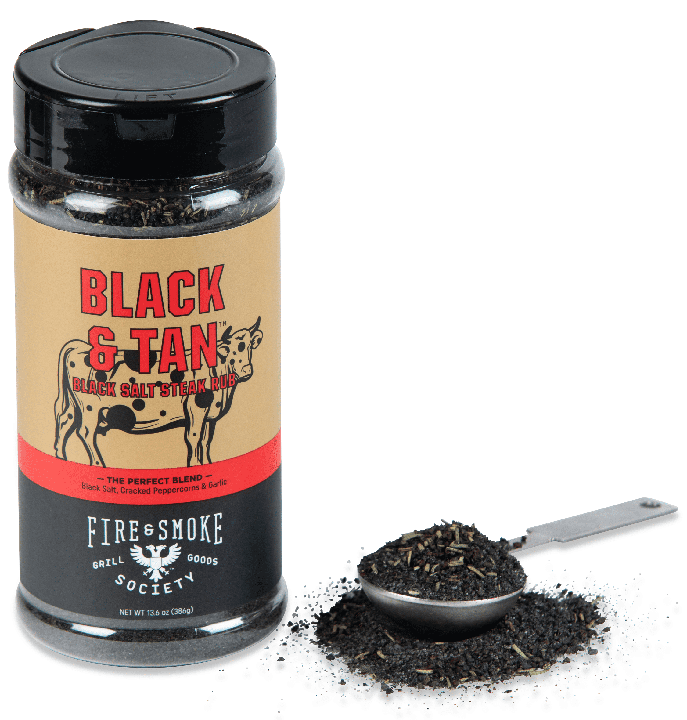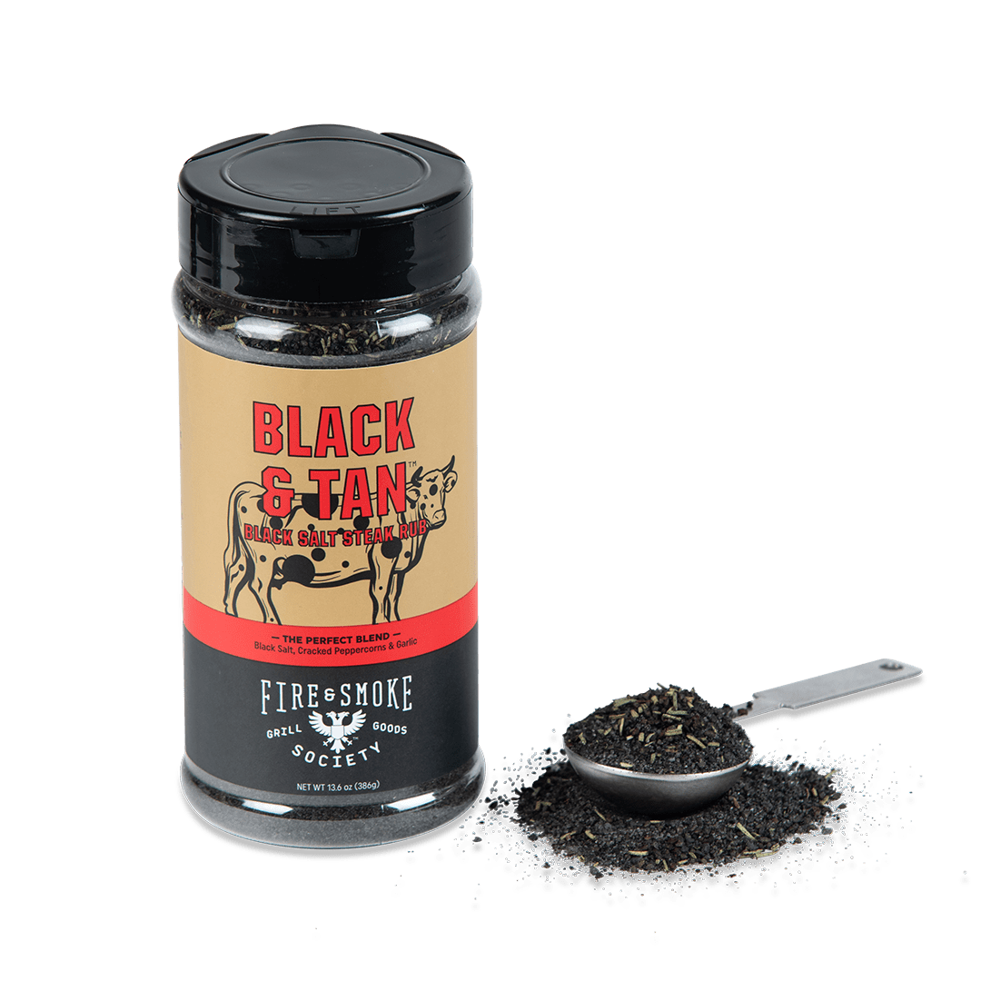 Fire & Smoke Society Black & Tan, Beef and Steak Rub, 13.6 ounce Medium-rare, please. Our striking black blend was designed to give beef (especially steaks and brisket), lamb, pork, and game a delicious and dramatic looking bark that contrasts beautifully with a rosy interior. Shelf-Stable plastic bottle.