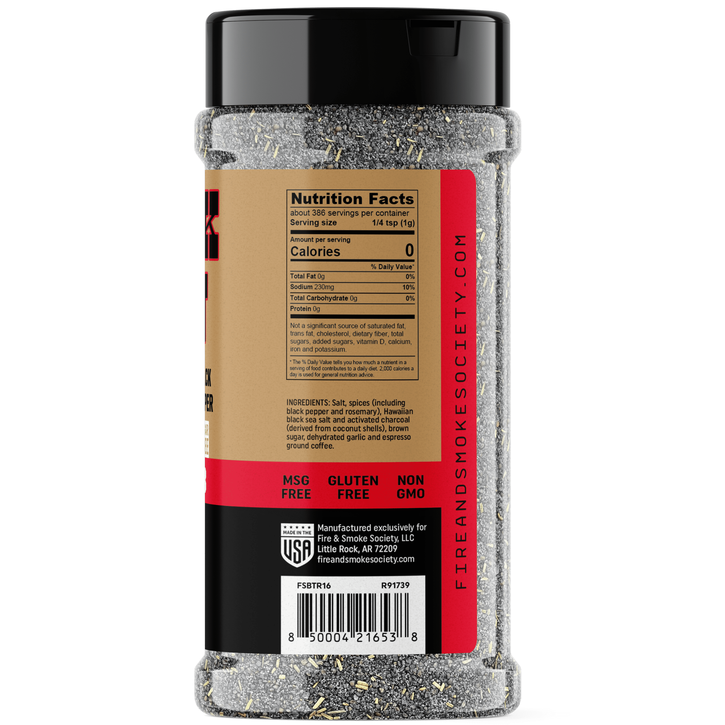 Fire & Smoke Society Black & Tan, Beef and Steak Rub, 16 oz with Hawaiian black salt, cracked black pepper, rosemary, and garlic creates an awesome looking rub that delivers robust and satisfying steakhouse flavors.