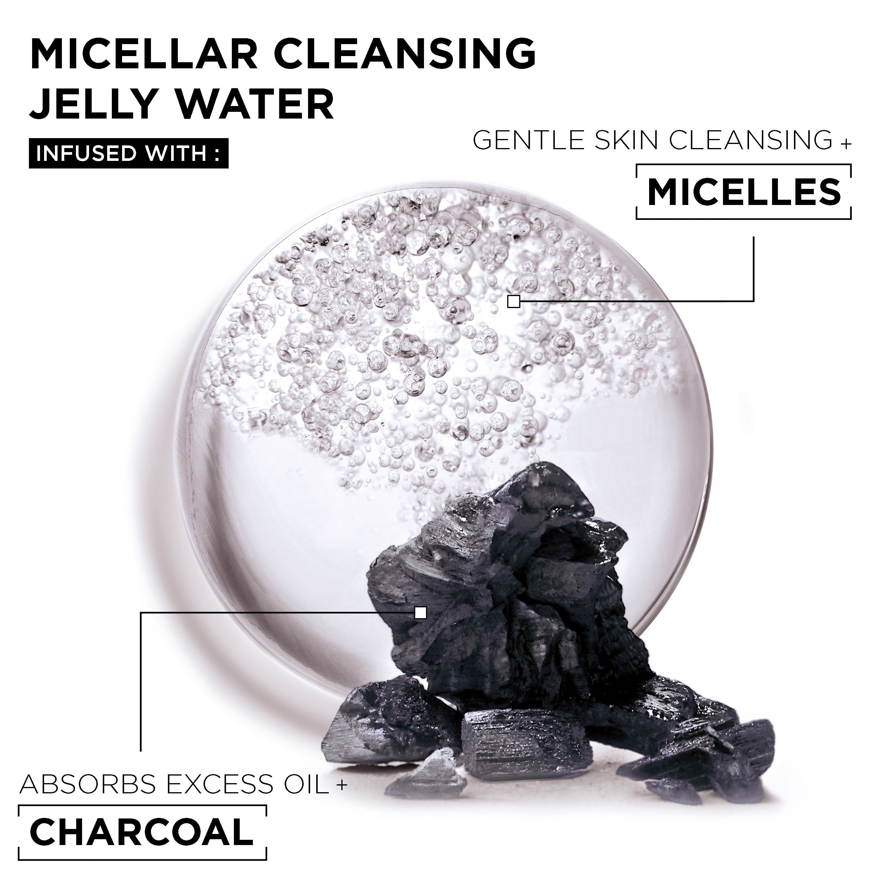 - This All-in-1 Garnier Micellar Cleansing Jelly Water with Charcoal cleanses, removes makeup and absorbs excess oil. Use as a purifying facial cleanser in the morning and as a gentle makeup remover at night; can also be used as a purifying toner. JELLY WATER FORMULA WITH CHARCOAL: expert formula to absorb excess oil, cleanses without over-drying. Micelles work like a magnet to gently cleanse, while removing makeup, dirt, SPF, and excess oil all in 1 step; No rinsing, no harsh rubbing. SUITABLE FOR ACNE PRONE SKIN: Formula is dermatologist and ophthalmologist tested for safety; No greasy residue. Approved by Cruelty-Free International. Vegan formula is free of oil, parabens, fragrance, sulfates, and silicone. *Source: Nielsen Measured Mass Market, Full Year 2021, Unit Sales