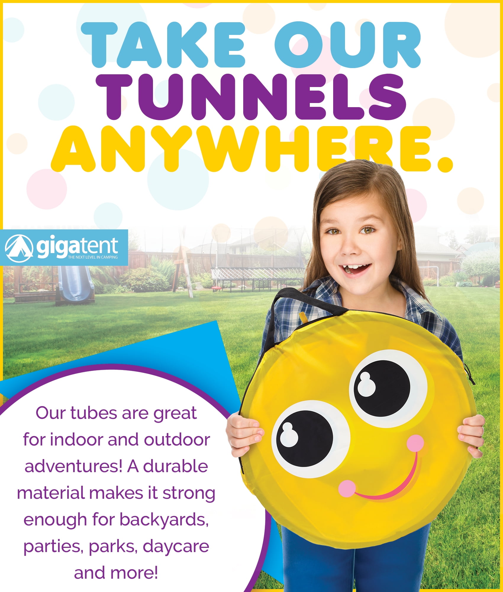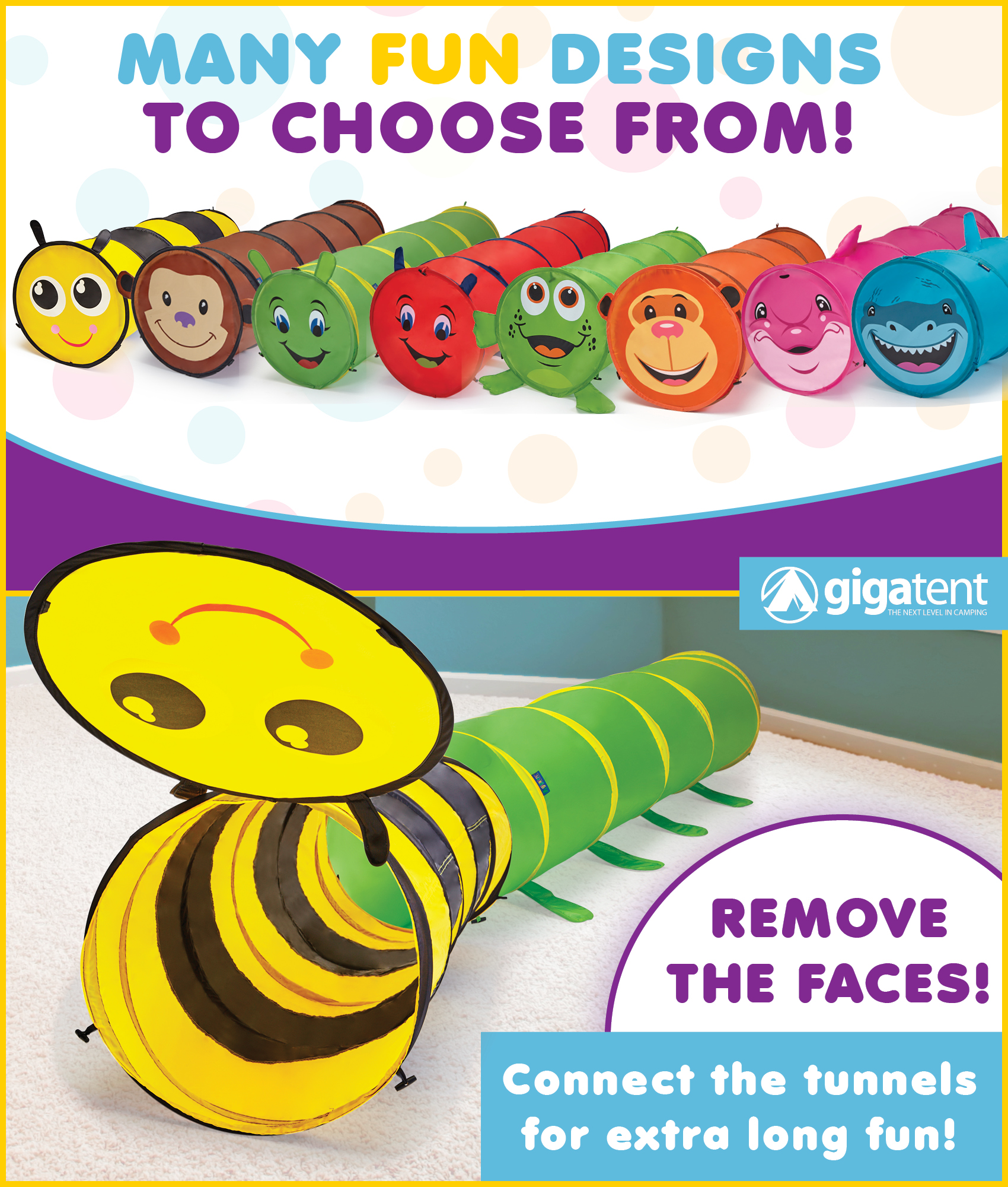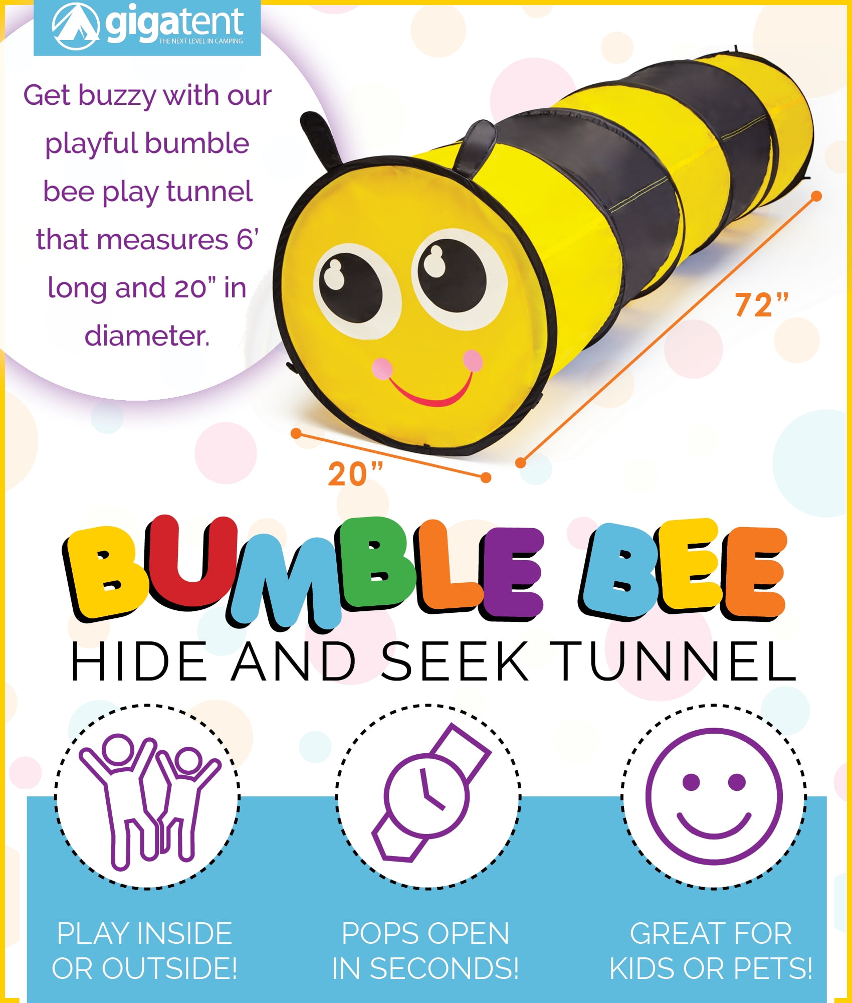 The GigaTent Hide and Seek “Queenie” Child Play Tunnel will give your child hours of fun and enjoyment. The face can be attached and detached with toggles and loops. This 6′ Hide and Seek Tunnel is 20″ in diameter, which allows larger children to play in the tunnel with ease. The floor and wall material are made of polyester, and the play tent with tunnel comes with a convenient storage bag for when it is not in use. Weighing only 3 lbs, this GigaTent “Queenie” Child Play Tunnel is suitable for use in the house or outside. BUMBLEBEE: Get buzzy with our playful bumblebee play tunnel that measures 6’ long and 20” in diameter. A charming happy face that can be detached makes it the perfect hiding place for games GREAT INDOORS & OUTDOORS: Take our tunnels anywhere. Our tubes are great for outdoor adventures and durable material makes it strong enough for backyards, parties, parks, daycare and more! POPS OPEN IN 1 SECOND: Setting up your tunnels of fun is quick and simple. A popup design and lightweight construction make it easy for kids and adults to arrange them anywhere in the house or outside. FOR CHILDREN & PETS: Not only perfect for imaginative play for your toddlers, but this also makes a great running and agility tunnel for small dogs and cats. It measures 20″ in diameter and 72″ long (6 Feet). CARRY CASE: A convenient zipper bag and a lightweight design make it easy to transport these portable tunnels. Take it to the park, playground or use it to make birthdays and kids parties more interactive. Encourage kids to get moving with toys that are interactive. Bring the playground indoors with the Pop-Up Play Tunnel from GigaTent where kids can explore their imagination and creativity. They fold flat and are easy to carry around so you can bring the fun anywhere! Durable material makes the tunnels long-lasting and perfect for indoors or outdoors. Crawling in and out of tunnels can be a great way for children to stay active and it’s great for muscle development. Setting up your tunnel is as simple as unzipping the bag and it pops open. SUPERIOR DESIGN At GigaTent we make our products with you in mind. Our tunnels are constructed from high-quality materials that are made to last. An ergonomic design makes it easy to fold and store while easy to use functions make it easy to set up and carry. PORTABLE AND VERSATILE Transport and carry your tunnels anywhere with our convenient carrying case. Our flexible tunnels are constructed from a lightweight material and easily fold to fit into their zippered bag. Turn your living room into a jungle gym or make the backyard an exploration for adventure. Set them up for kid’s birthday parties. It also makes a great tool for daycare and classrooms. Babies, toddlers, and children will enjoy crawling in and out of these tubes. Get your crawl on in these awesome play tubes today!