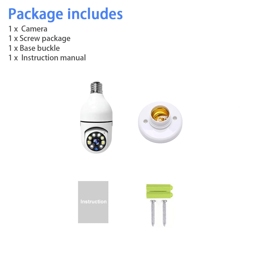 This wireless WiFi home security camera system supports 2.4Ghz&5Ghz Wi-Fi. You can monitor it via APP anywhere anytime after connection to router, convenient and practical. Compatible with E27 light socket makes it quite easy to installl this camera, simply screw this camera into a light socket. This PTZ dome surveillance camera adopts a highly sensitive motion sensor. If some people invade your home, this security camera will track the motion and record every single move. This 360 degree wifi lightbulb security camera provides 1080P HD image quality for a clear and crisp viewing experience and comes with FULL-COLOR night vision so you can monitor your home at day or night. Our light bulb camera equipped with incorporate microphone and speaker, create a perfect two-way conversation, which allows you to keep in touch with your family or pets anywhere anytime with built-in speaker. Furthermore, these lamp eye camaras 355° pan and 120° tilt function allows you to remotely adjust the camera viewing angle via the App so that you can monitor every corner of the house. The bulb security camera support cloud storage and TF card storage, up to 128GB expansion, memory card is not included in the package.
