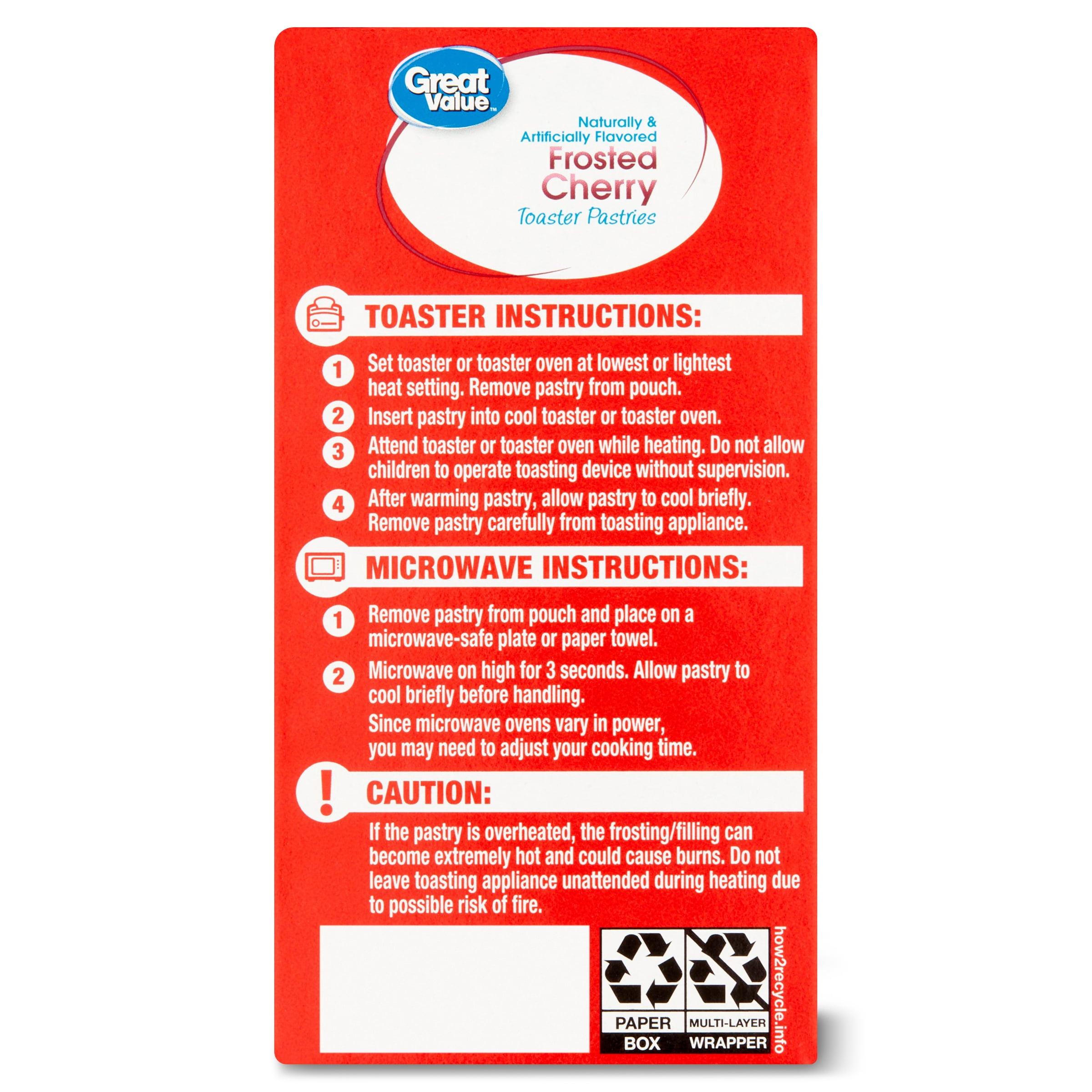 Great Value Frosted Cherry Toaster Pastries deliver the ultimate sweet treat to your taste buds. Filled with delicious cherry filling, frosted with sweet icing, and topped with colorful sprinkles, these pastries are perfect for quick and easy snacking at home, in the office or on the go. Enjoy them hot or cold as a tasty breakfast or as a pick-me-up snack at any time of the day. Make it an extra special treat and serve with a glass of cold milk. They are also an excellent source of six different vitamins and minerals. Each box contains 12 toaster pastries, perfect for eating at home or stashing in your bag or purse for a quick snack during the day. Satisfy your cherry cravings with the wonderful taste of Great Value Frosted Cherry Toaster Pastries.