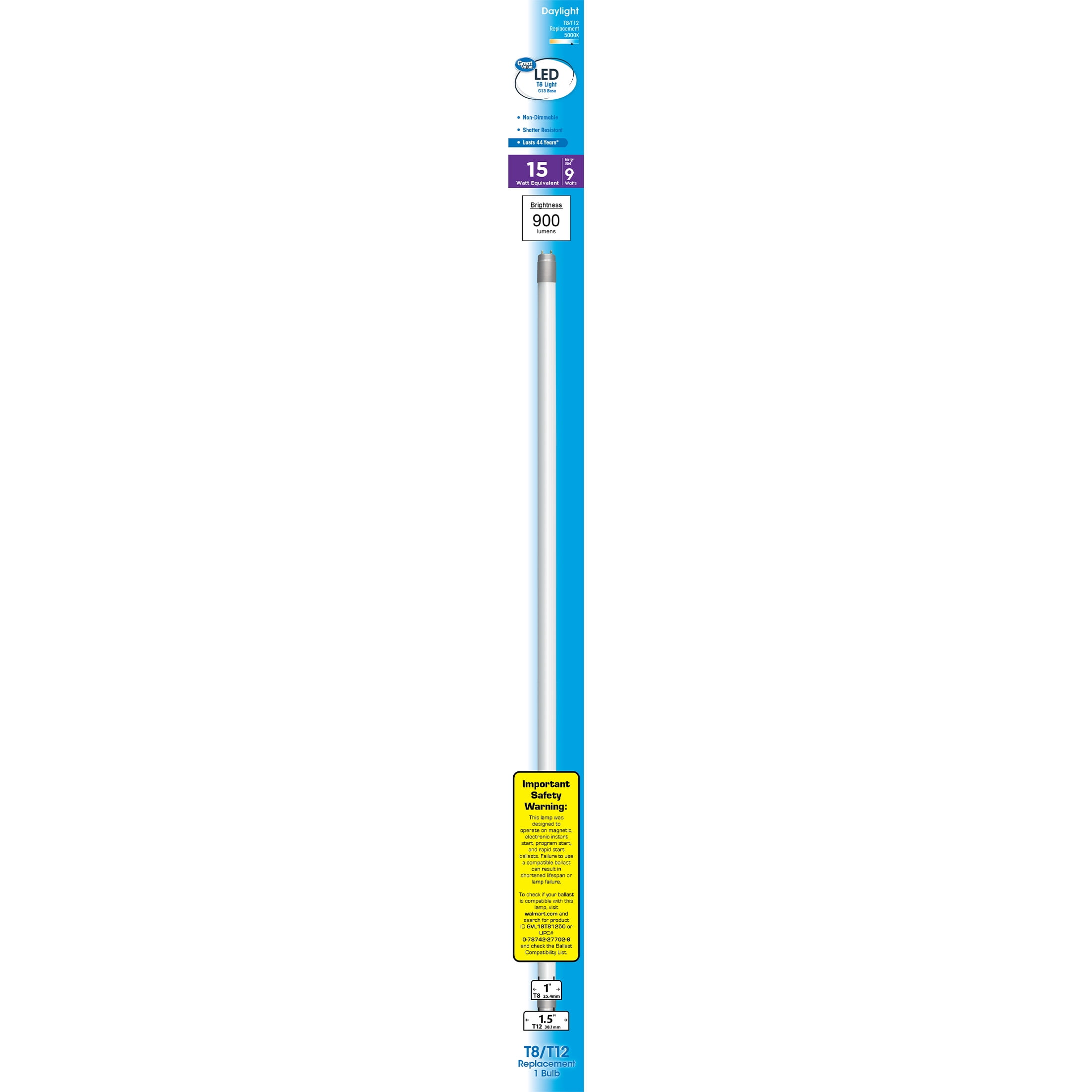 LEDT8/T12 lamps do not waste light Making them 50% more efficient than fluorescent lamps This product complies with part 18 of the FCC rules. Operation is subject to the following two conditions: (1)this device may not cause harmful interference, and (2) this device must accept any interference received, including interference that may cause undesired operation. Any changes or modifications not expressly approved by the manufacturer could void the user’s authority to operate the equipment. Note: This product complies with part 18 of the FCC rules but may cause interference to radio equipment and should not be instal LED near maritime safety communications equipment or other critical navigation or communication equipment operating between 0.45-30 MHz. This device complies with CAN ICES-005B. Minimum starting temperature -20C. $0.72 savings per year* vs fluorescent *((Fluorescent watts – LED watts) x .11 p/kwh x 1095 hours)/1,000kwh This lamp was designed to operate on magnetic, electronic instant start, program start, and rapid start ballasts. Save money and energy when you replace your traditional fluorescent bulbs with a Great Value LED18 inches Daylight 9 Watts Fluorescent Lamp. This bulb fits most 18-inch fluorescent light fixtures, and provides bright, beautiful daylight, producing the equivalent of 15 watts of light using only 9 actual watts. With its 50,000 hour life, it lasts about 44 years, so it reduces waste as well as energy costs. Update your lighting with a Great Value LED18 inches Daylight 9 Watts Fluorescent Lamp. Great Value products provide families with affordable, high quality grocery and household consumable options. With our wide range of product categories spanning grocery and household consumables, we offer you a variety of products for your family’s needs. Our products are conveniently available online and in Walmart stores nationwide, allowing you to stock up and save money at the same time. CAUTION RISK OF ELECTRIC SHOCK – DO NOT USE WHERE DIRECTLY EXPOSED TO WATER DIRECT REPLACEMENT FOR THE FOLLOWING LAMPS ONLY: 15W/18T8, 15W/18T12 CAUTION – RISK OF FIRE. USE ONLY IN PLACE OF FLUORESCENT LAMPS SPECIFIED ON LABEL. CAUTION – RISK OF FIRE. IF THE LED TUBE EXHIBITS UNDESIRABLE OPERATION (BUZZING, FLICKERING, ETC.), IMMEDIATELY TURN OFF POWER, REMOVE LED TUBE FROM LUMINAIRE AND CONTACT MANUFACTURER. CAUTION – RISK OF FIRE – IF INSTALLING THIS LAMP IN A PRE-HEAT LUMINAIRE, REMOVE THE AUTOMATIC STARTERS FROM THEIR HOLDERS BEFORE INSTALLING LAMP. Not evaluated for use with emergency exit fixtures or emergency exit lights. CAUTION: When changing lamps, turn off power to the fixture to avoid electrical shock.