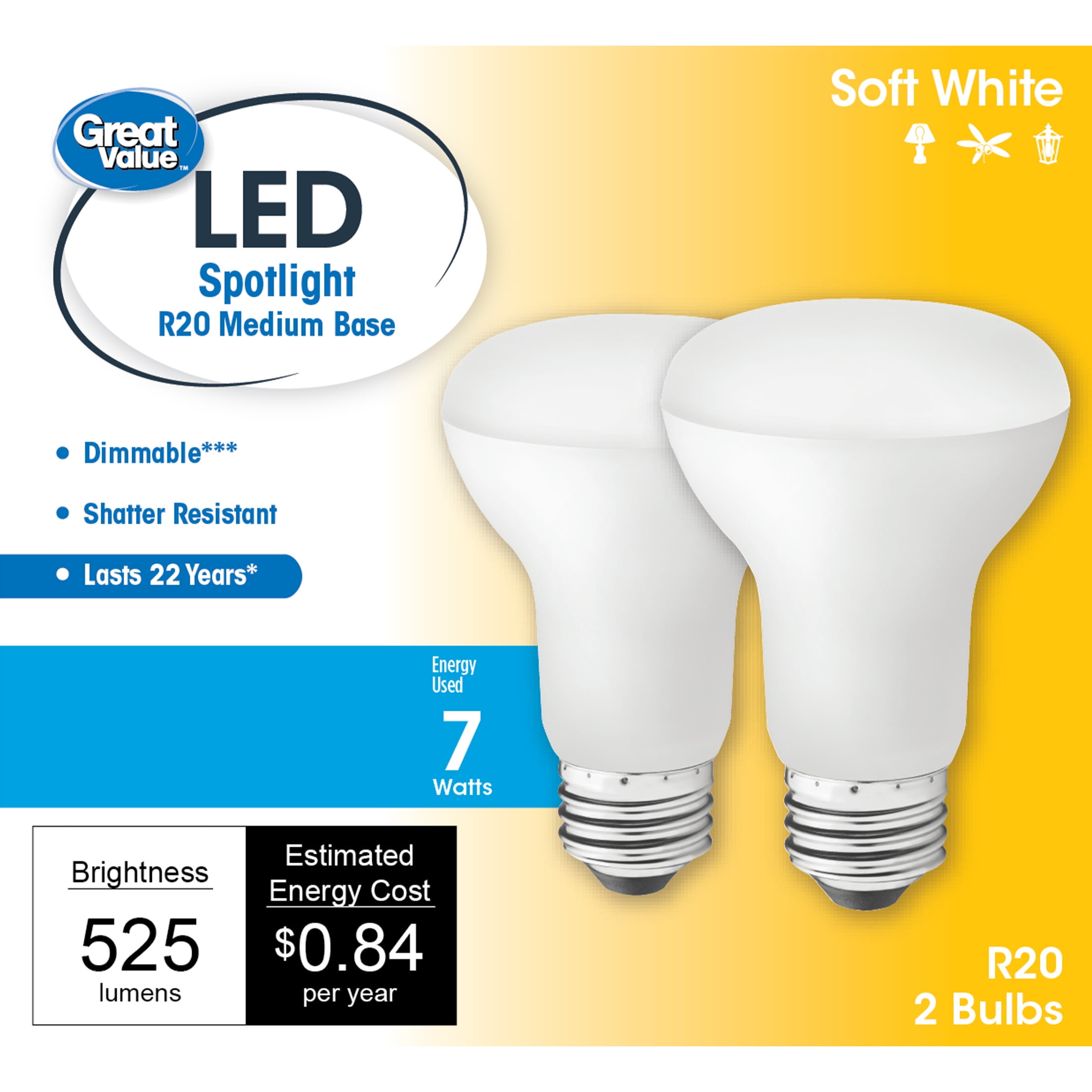 Great Value LED Light Bulb, 7W (50W Equivalent) R20 Floodlight Lamp E26 Medium Base, Dimmable, Soft White, 2-Pack
