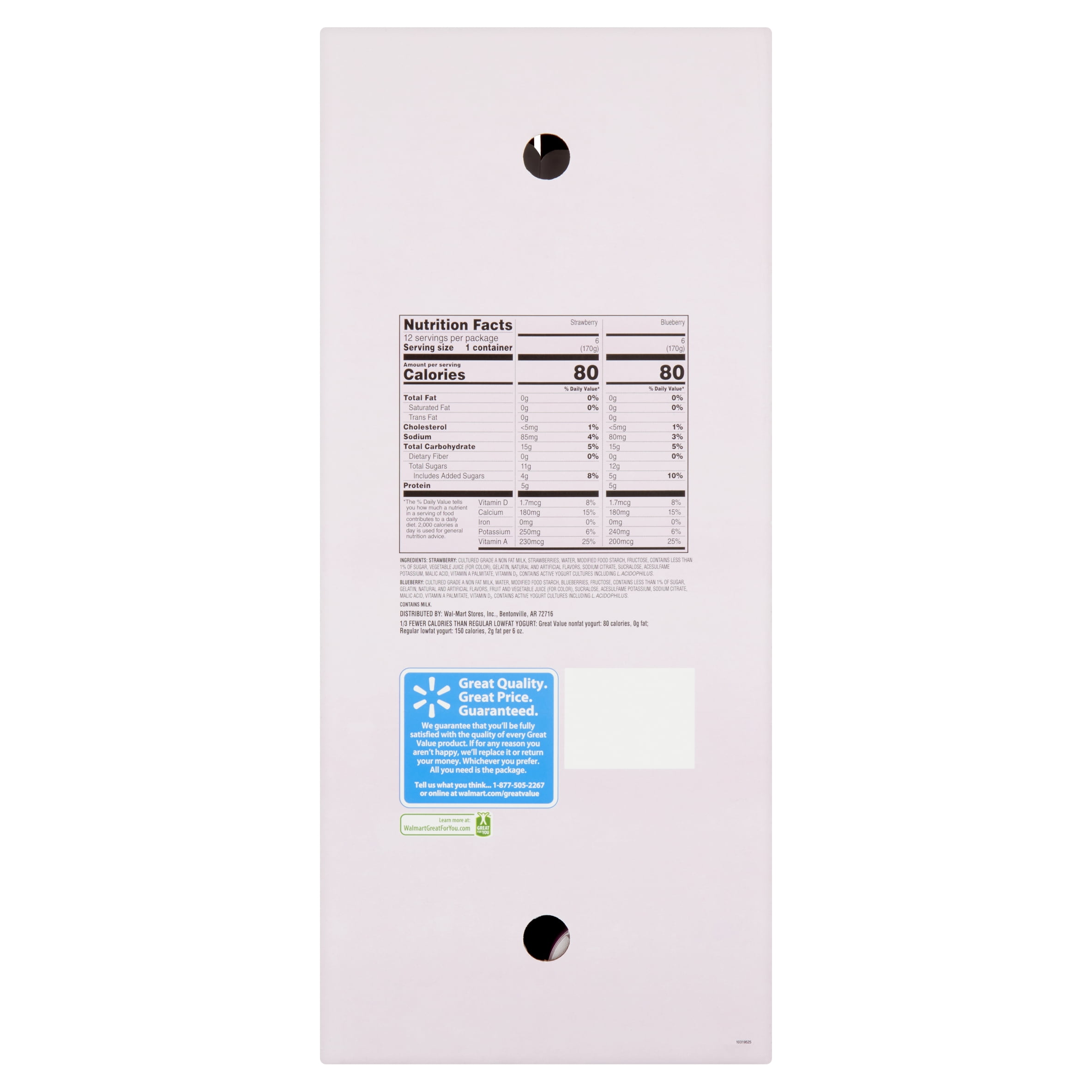 Give your family a healthy and delicious treat with Great Value Light Strawberry Blueberry Nonfat Yogurt. This lowfat yogurt comes in 12 individually packaged servings, 6 of each flavor, making them ideal for school lunches, family road trips, at the office, camping, and more! With zero fat and only 80 calories per serving, this yogurt has earned our esteemed ?Great For You? label designation. Great Value Light Strawberry Blueberry Nonfat Yogurt has added vitamin A and D and ? fewer calories than regular lowfat yogurt, making this yogurt a great choice for a guilt-free treat.