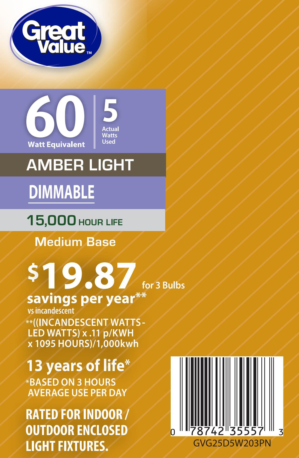 - Great Value Vintage Light Bulb 60W Equivalent Amber Light G25 E26 3Pk