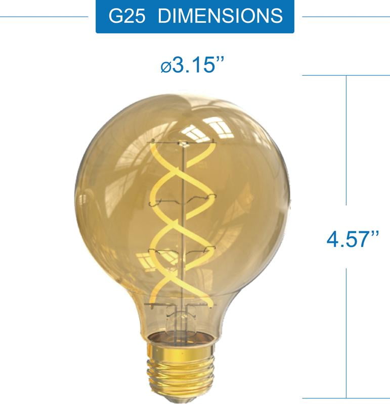Great Value Vintage Style Spiral flexible Filament 60-Watt Replacement Amber light G25 LED light bulb creates a dramatic focal point in any room.The sizeable glass globe and delicate spiral filament beautifully accent traditional or modern fixtures. A warm amber light glow that recreates the feel of Edison-style incandescent bulbs. These LED light bulbs are dimmable, have a clear all-glass exterior, and provides an omni-directional (360°) distribution of light.This decorative bulb is rated to last 13 years based on 3 hours per day use. This light bulb uses only 5.0-Watt of energy – that is a 93% savings over traditional lighting – and that means savings on your energy bill every month.It features instant full brightness and is free of Mercury for easy disposal. Use this Vintage Style G25 global-Shaped bulb with a medium base in dimmable pendant lights, table lamps and floor lamps. Remove the lamp shade and highlight the refined style of GV Vintage Style LED bulbs. Bulbs can not perform properly with incompatible dimmers. Dimming compatibility list as attached photo. NOTE: This equipment has been tested and found to comply with the limits for a Class B digital device, pursuant to part 15 of the FCC Rules. These limits are designed to provide reasonable protection against harmful interference in a residential installation. This equipment generates, uses and can radiate radio frequency energy and, if not installed and used in accordance with the instructions, may cause harmful interference to radio communications. However, there is no guarantee that interference will not occur in a particular installation. If this equipment does cause harmful interference to radio or television reception, which can be determined by turning the equipment off and on, the user is encouraged to try to correct the interference by one or more of the following measures: 1.Reorient or relocate the receiving antenna. 2.Increase the separation between the equipment and receiver. 3.Connect the equipment into an outlet on a circuit different from that to which the receiver is connected. 4.Consult the dealer or an experienced radio/TV technician for help.