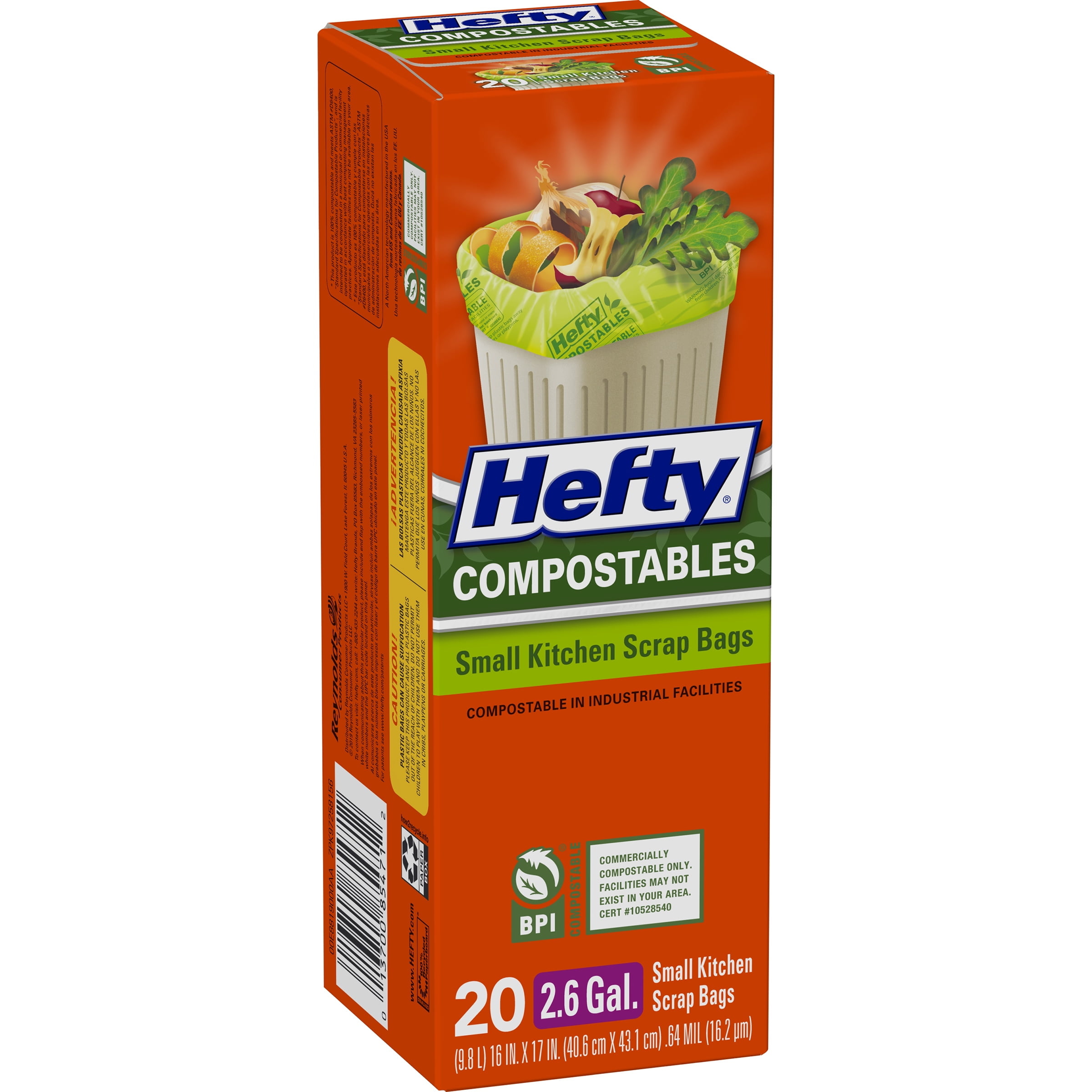 - This package contains 20 Hefty Compostable, green, 2.6 gallon kitchen compost bags, each 0.6 mil thick