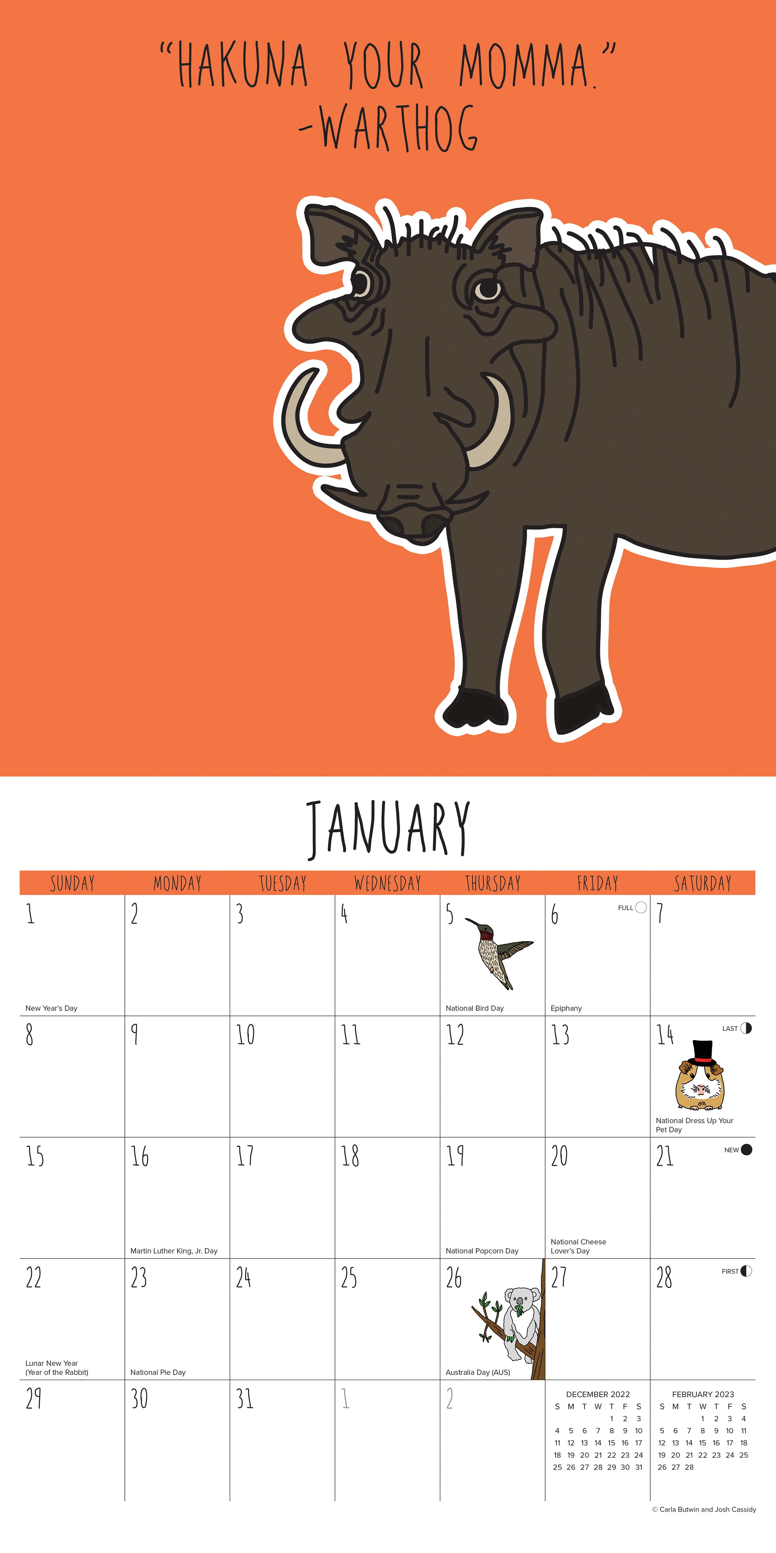 Born from the hit Tumblr blog, “If _____ Could Talk”, creators Carla and Josh use their witty writing and unique illustration style to dive deep into the minds of your favorite animals. (Seriously, they get all up in there.) This is one of those rare calendars considered to be both the Bees Knees AND the Cats Meow. Printed with soy-based inks on FSC certified paper, this 12" x 12" wall calendar features large monthly grids that offer ample room for jotting notes, along with six bonus months of July through December of 2022. Also includes moon phases (CST), standard U.S. and international holidays and a smattering of unexpected ones like National Donut Day, National Taco Day and Mean Girls Day.