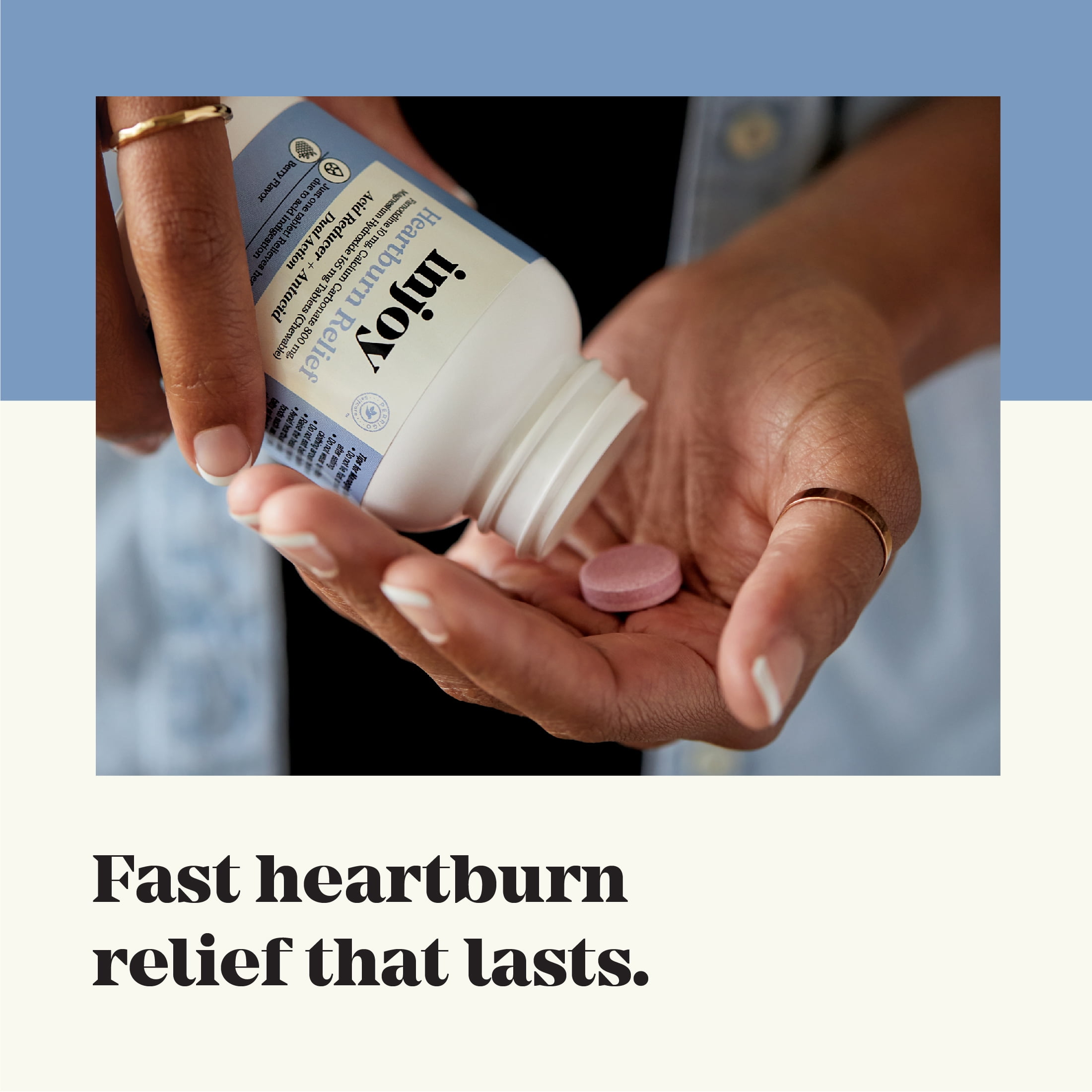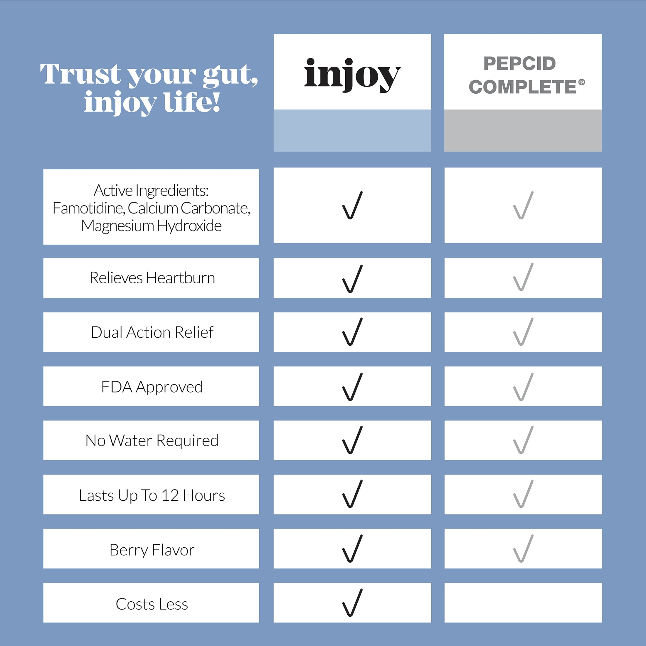 injoy Dual Action Complete, Chewable Tablets, Berry Flavor, has the active ingredients famotidine 10 mg, calcium carbonate 800 mg and magnesium hydroxide 165 mg. These medicines work together to help relieve heartburn due to acid indigestion. Gluten free heartburn medicine with acid reducer plus antacid is intended for adults and children 12 years and over. Just one tablet relieves heartburn due to acid indigestion. Chewable berry flavor tablets, no water required.