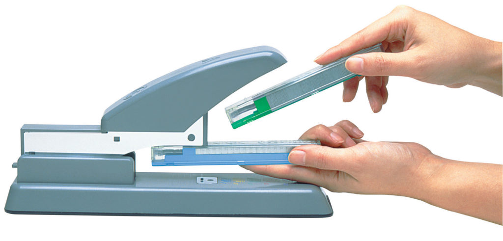 Unique, color-coded staple cassettes are designed for use with Switch Heavy-Duty Cassette Staplers. Staple cassettes are changed easily for stapling various page quantities.