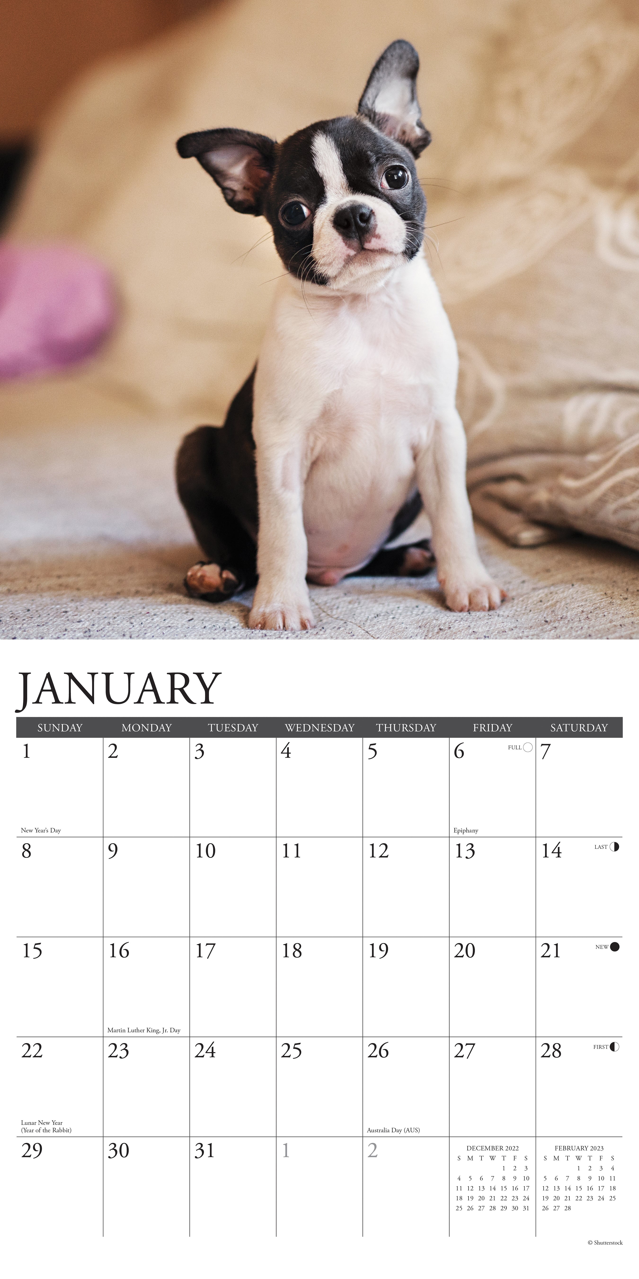 What’s black and white and cute all over? Boston Terrier puppies, of course! Twelve adorable full color photographs embody all the charming traits of this enormously popular breed. Printed with soy-based inks on FSC certified paper, this 12" x 12" wall calendar features large monthly grids that offer ample room for jotting notes, along with six bonus months of July through December of 2022. Also includes moon phases (CST), standard U.S. and international holidays.