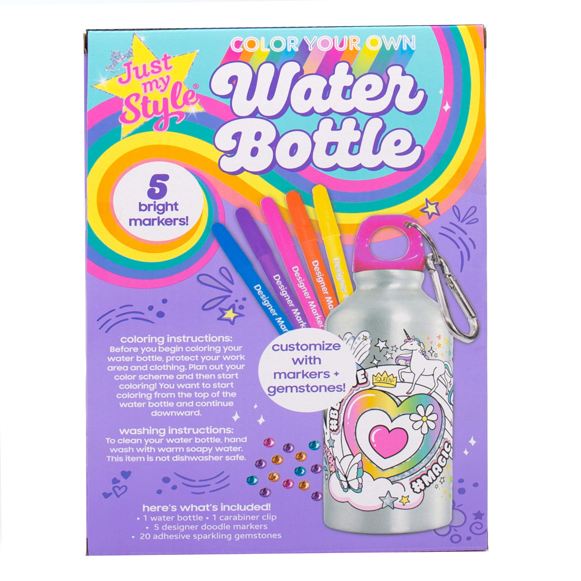 Color and personalize a fun go-to accessory with the Just My Style Color Your Own Water Bottle kit! Design pre-printed illustrations with fun color patterns using vibrant markers to bring out each detail. Embellish your water bottle and make your colorful details pop with sparkly adhesive gemstones. This BPA free water bottle is safe and convenient for everyday use to keep you hydrated on the go! Wash with ease using warm soapy water.
