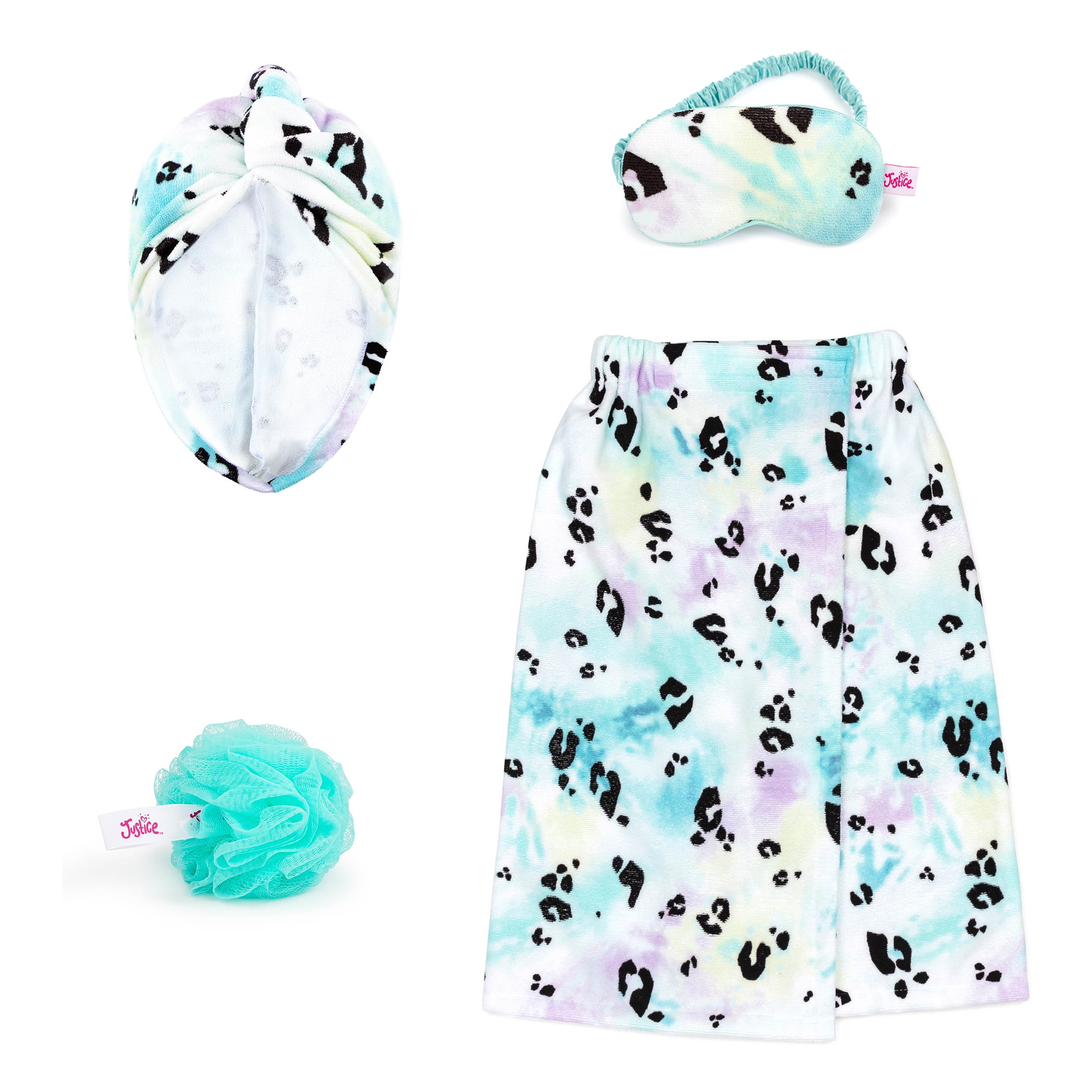 Justice Rainbow Cheetah 4-Piece Spa Set with Bath Towel Wrap, Eye Mask and Loofah