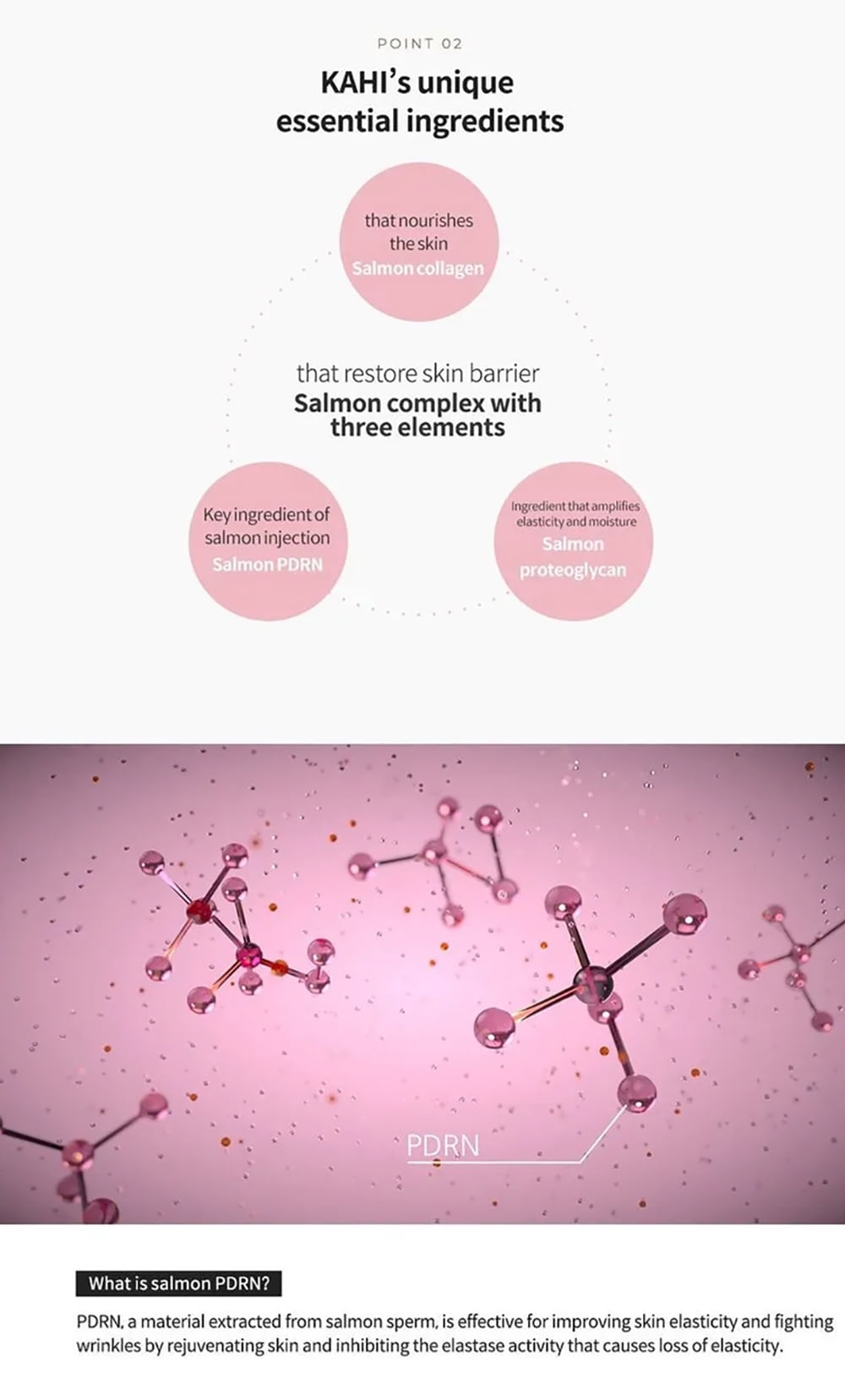 - Infused with Salmon Complex such as Salmon Collagen and Salmon PDRN, which increases the synthesis of collagen in the skin to restore the elasticity of the skin effectively.