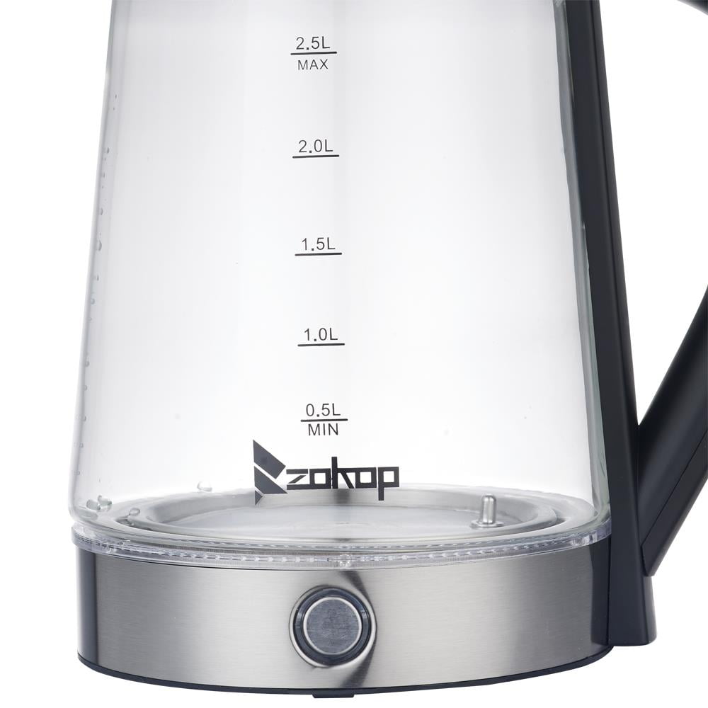 The ZOKOP HD-2005D 110V 1500W 2.5L Blue Glass Electric Kettle with Filter is the perfect blend of elegance and functionality. Not only is this kettle a beautiful addition to any kitchen countertop, but it also boils water efficiently, saving time and energy over the use of conventional stovetop kettles. Their unique, modern, and stylish design looks great on any counter top. A halo of LED lights beautifully illuminates the pot when it’s in use, so it’s not only practical, but very attractive to look at. Large pouring spout with mesh filter for perfect, spill proof pours. In a matter of minutes, hot water will be ready to use for instant coffee, tea, hot cereal, instant macaroni, soup, or oatmeal.