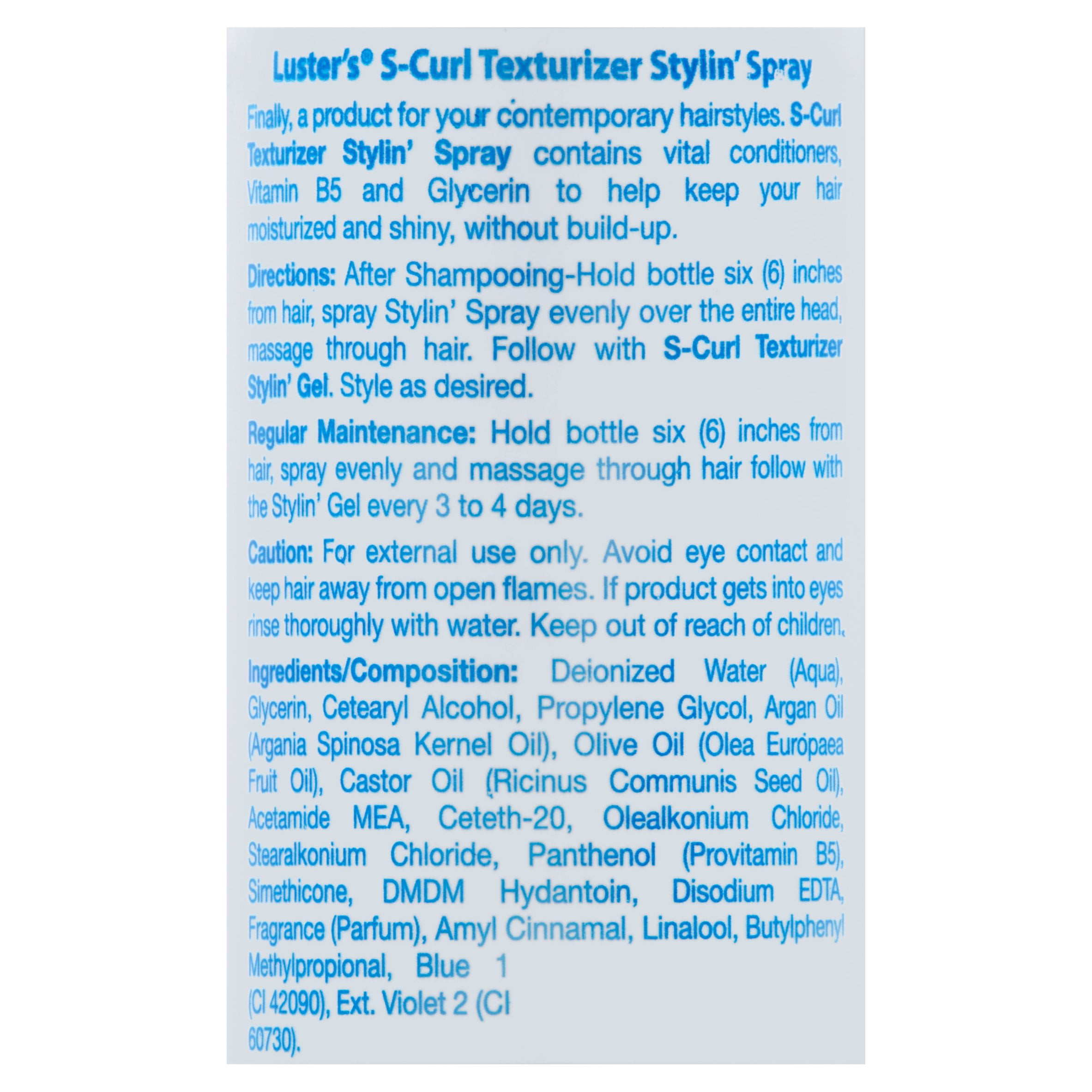 Texturizer, Stylin Spray, Bottle 8 OZ Moisturizer for waves shortcuts. Lusters S-Curl Texturizer Stylin Spray: Finally, a product for your contemporary hairstyles, S-Curl Texturizer Stylin Spray contains vital conditioners, vitamin B5 and Glycerin to help keep your hair moisturized and shiny, without build-up. After Shampooing – Hold bottle six (6) inches from hair, spray Stylin Spray evenly over the entire head, massage through hair. Follow with S-Curl Texturizer Stylin Gel. Style as desired. Regular Maintenance: Hold bottle six (6) inches from hair, spray evenly and massage through hair follow with the Stylin apos; Gel every 3 to 4 days. Good for 12 months once opened. Caution: For external use only. Avoid eye contact and keep hair away from open flames. If the product gets into the eyes rinse thoroughly with water. Keep out of reach of children. 8 fl oz (236 ml) Chicago, IL 60609 Luster Products, Inc.