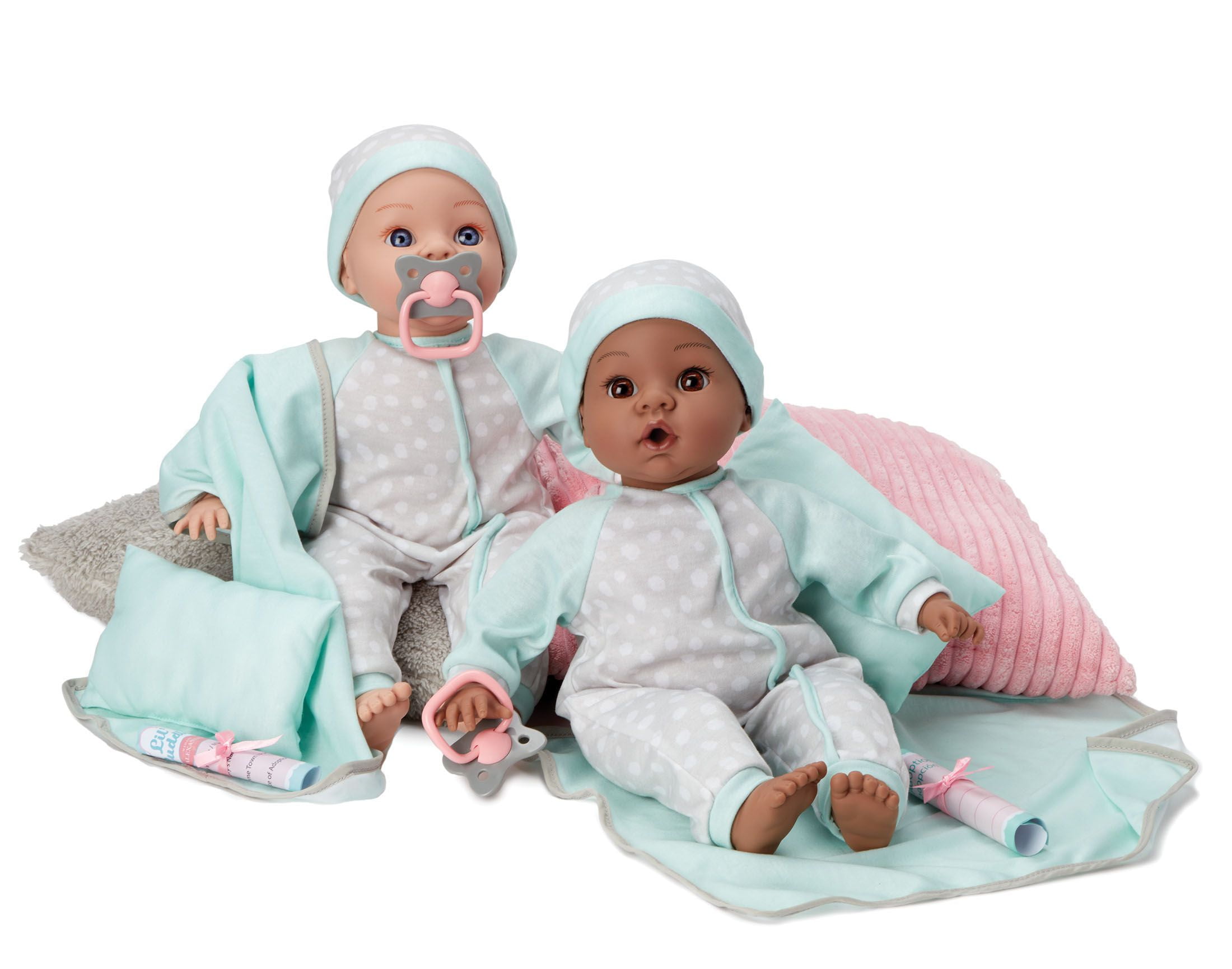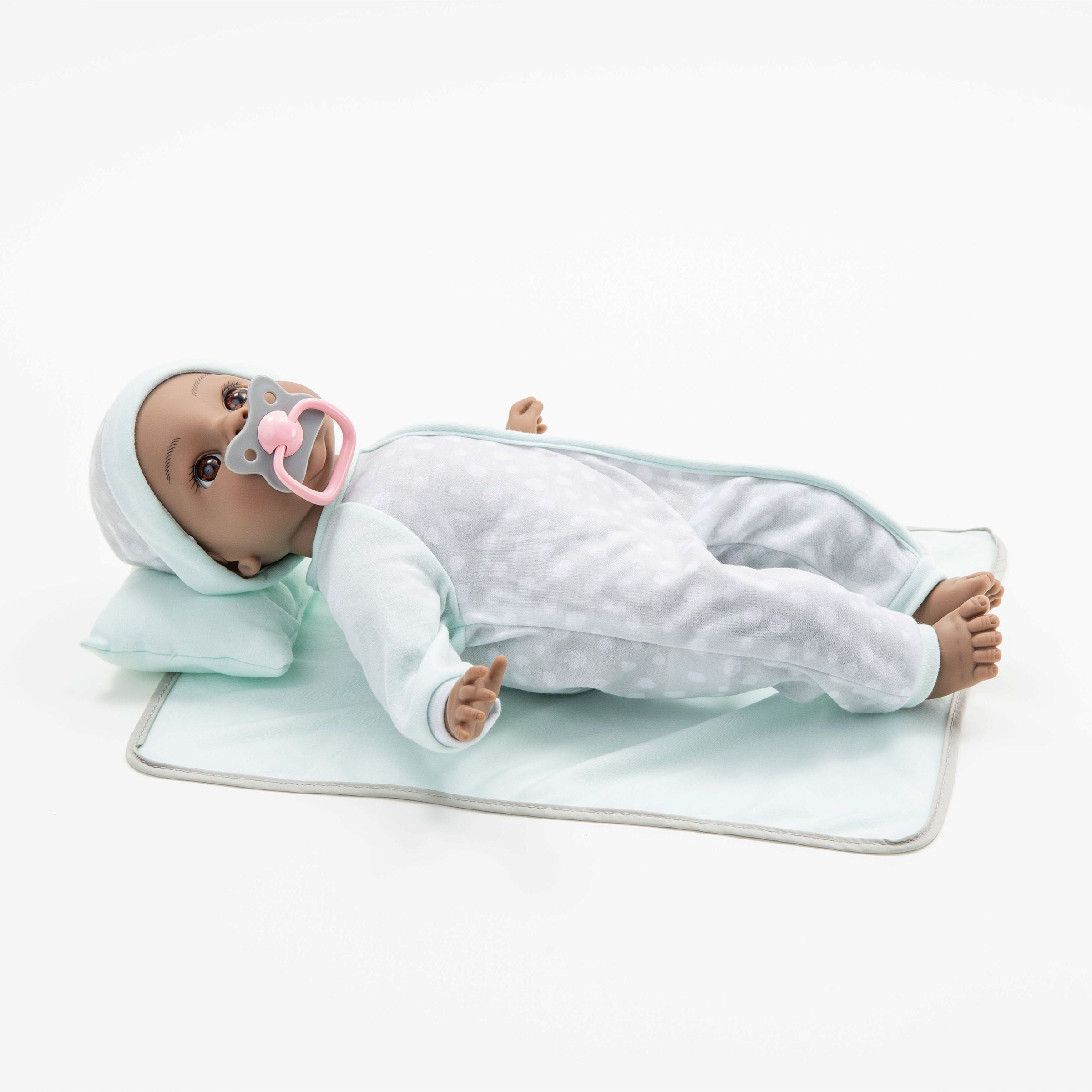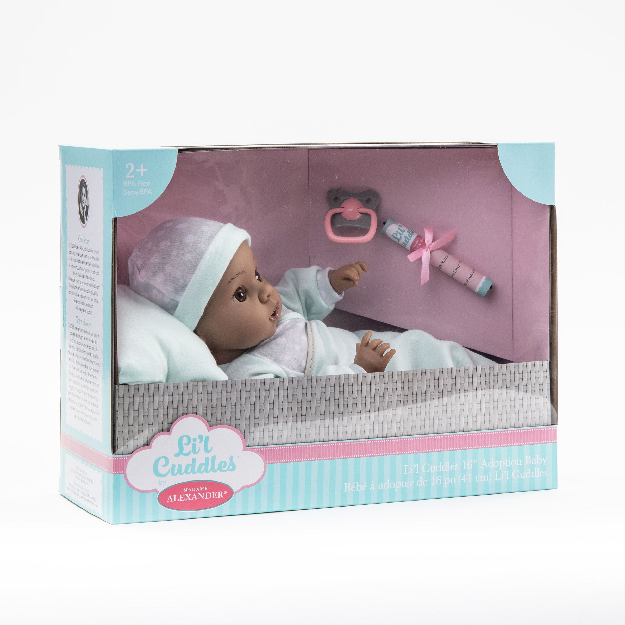 Madame Alexander Dark Skin Tone Lil’ Cuddles 16” Adoption Baby Doll Bringing baby home is a reason to celebrate! Help your child understand the adoption process with this special baby doll set, featuring a beautiful 16” Lil’ Cuddles by Madame Alexander doll. Set includes doll in sleeper with matching night cap, pillow, blanket, pacifier, and an adoption certificate your child can complete.