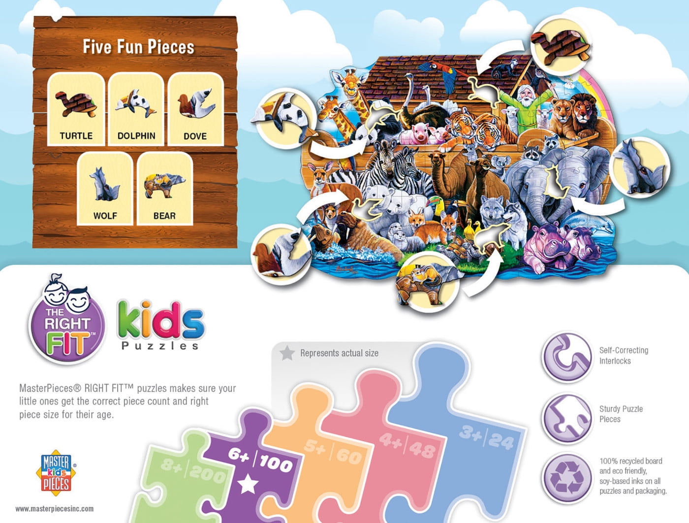 This Noah’s Ark Shaped puzzle features Noah and all the animals aboard the ark, as the rainbow appears and the dove flies off in search of land. This puzzle is 100 pieces and 19.5 inches x 14 inches in size. Look for The Right Fit® puzzles collection and make sure your little one gets the correct piece count and size for a good challenge for their age. This puzzle is the right fit for ages 6+.