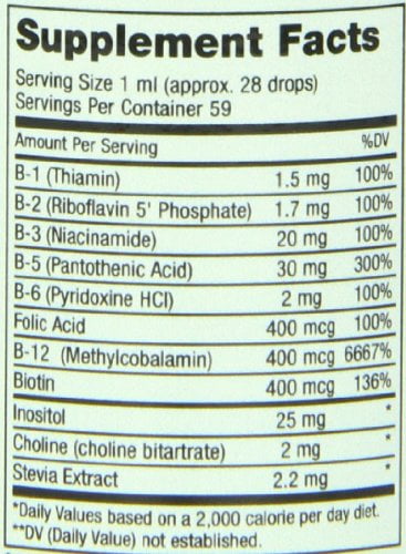 Nutrition Facts: B1 (Thiamin) 1.5 mg 125%’ B2 (Riboflavin 5′ Phosphate) 1.7 mg 131%’B3 (Niacinamide) 20 mg 125%’B5 (Pantothenic Acid) 30 mg 600%’B6 (Pyridoxine HCI) 2 mg 118%’Folic Acid (400 mcg Folic Acid) 680 mcg DFE 170%’Vitamin B12 (Cyanocobalamin, methylcobalamin) 400 mcg 16,667%’Biotin 400 mcg 1,333%’Inositol 25 mg **’Choline (choline bitartrate) 2 mg <1%’Stevia Leaf Extract 2.2 mg **