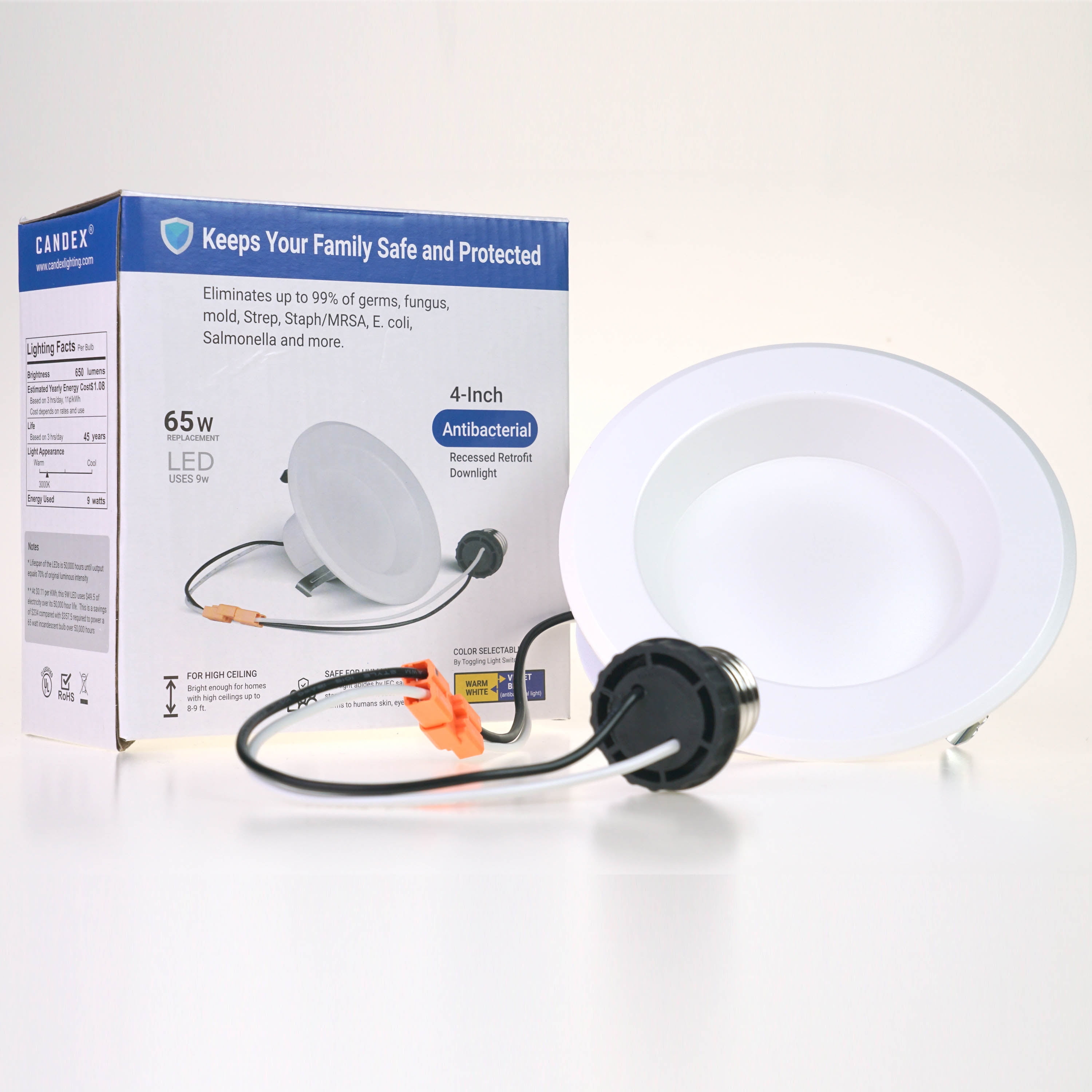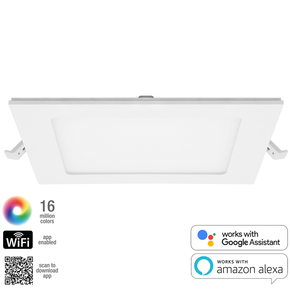 These 6 inch ultra thin smart LED downlights are WiFi-enabled and voice control compatible with no hub required. They are dimmable, multicolor WiFi downlights, which allow you to set schedules and control brightness without installing dimmers or timer switches. These slim panel wifi lights clip into your ceiling with no housing or ceiling can needed. They each come with a metal junction box, also known as a J-Box, giving you everything needed to install this beautiful, ultra thin canless recessed lighting solution. You can choose color temperatures ranging from 2700K to 6500K and 16 million color options. These smart downlights conveniently work with Google Assistant and Amazon Alexa using the TuyaSmart app. Since they respond to your voice, you can always walk into a well-lit room instead of reaching for the light switch. Simply set up your lights to brighten, dim or change color at scheduled times to fit your daily routine. These dimmable, color-changing LED downlights are 900 lumens and equivalent to 50-watt incandescent lights while using only 12 watts of energy. They can operate in dry or damp settings, allowing you to use them in a variety of locations. With an expected lifetime of 35,000 hours, you won’t have to replace these energy efficient lights for years to come. They are ETL Listed, FCC compliant and come with a 3-year warranty. Eliminates the need for dimmer/timer switches. Not compatible with dimmers (dimming controlled via the app). Dimming range 20-100%. Downlights can be controlled as a group or individually via the app. Junction Box Dimensions: 3.54"W x 1.34"H x 3.4"D, Recommended Hole Cutout Diameter: 5.95". Includes Foam Gasket. Operating Temperature Range: -40°C to 80°C. Aluminum body with PVC lens.
