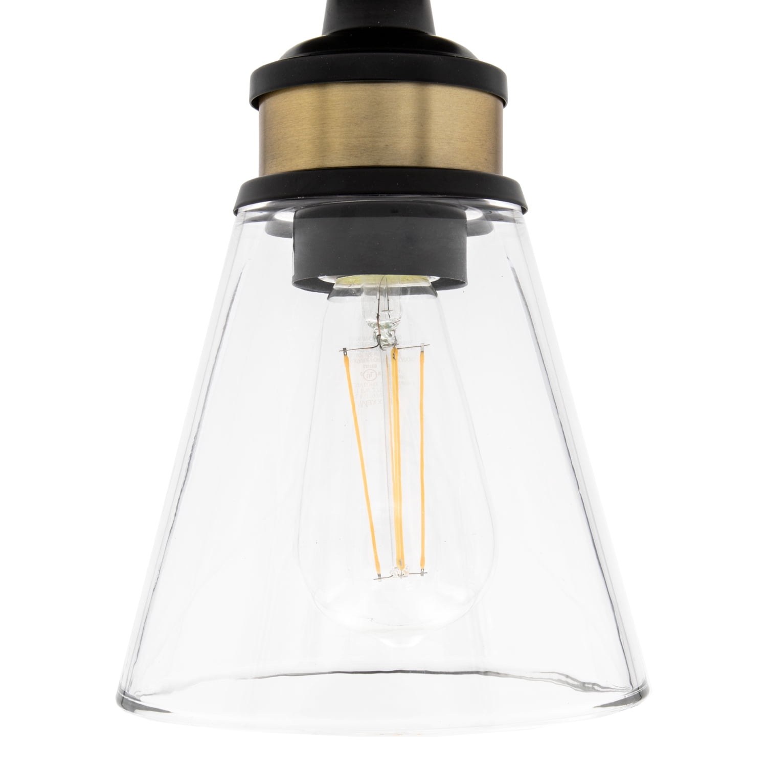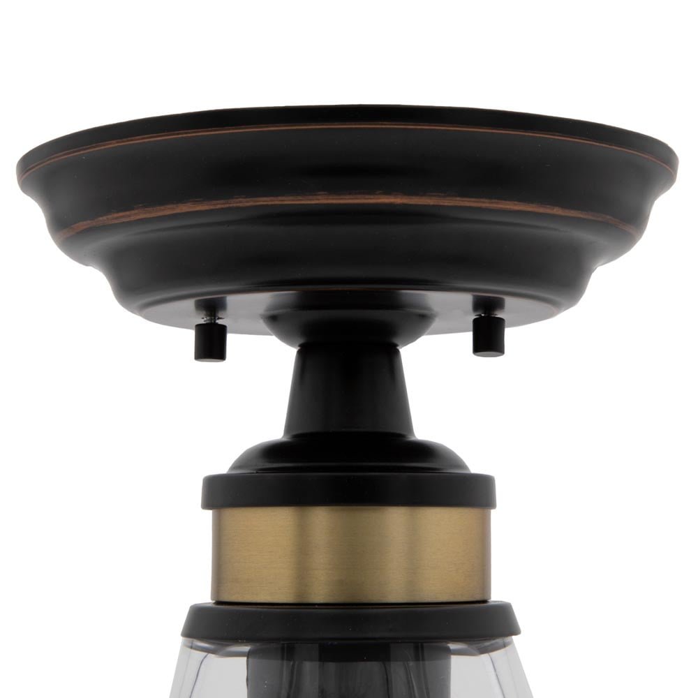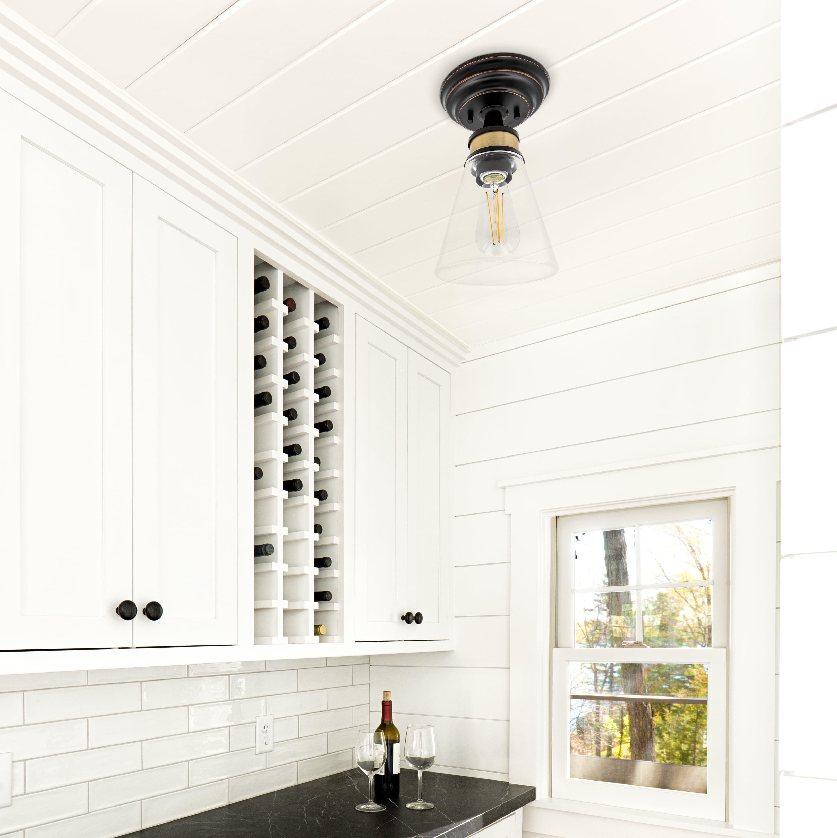 This beautiful LED ceiling light fixture features a clear glass lens, a single bulb and a metal base that is bronze with gold trim. The semi-flush mount design and vintage style Edison bulb (included) are the perfect way to complete the look of your room. The LED ST19 Edison light bulb produces 800 lumens of 2700K warm white light. This fixture is ETL listed with a 3-year warranty and the bulb is UL listed with a 1-year warranty. Included non-dimmable LED Edison bulb model # MLB-ST19700W. Fixture is compatible with dimmable bulbs (not included). Standard E26 base. Diameter of metal base: 6.5”. Diameter of the base of the glass lens is 3”, tapering out to 6”, Height of glass lens is 6”. 7” installation cord.