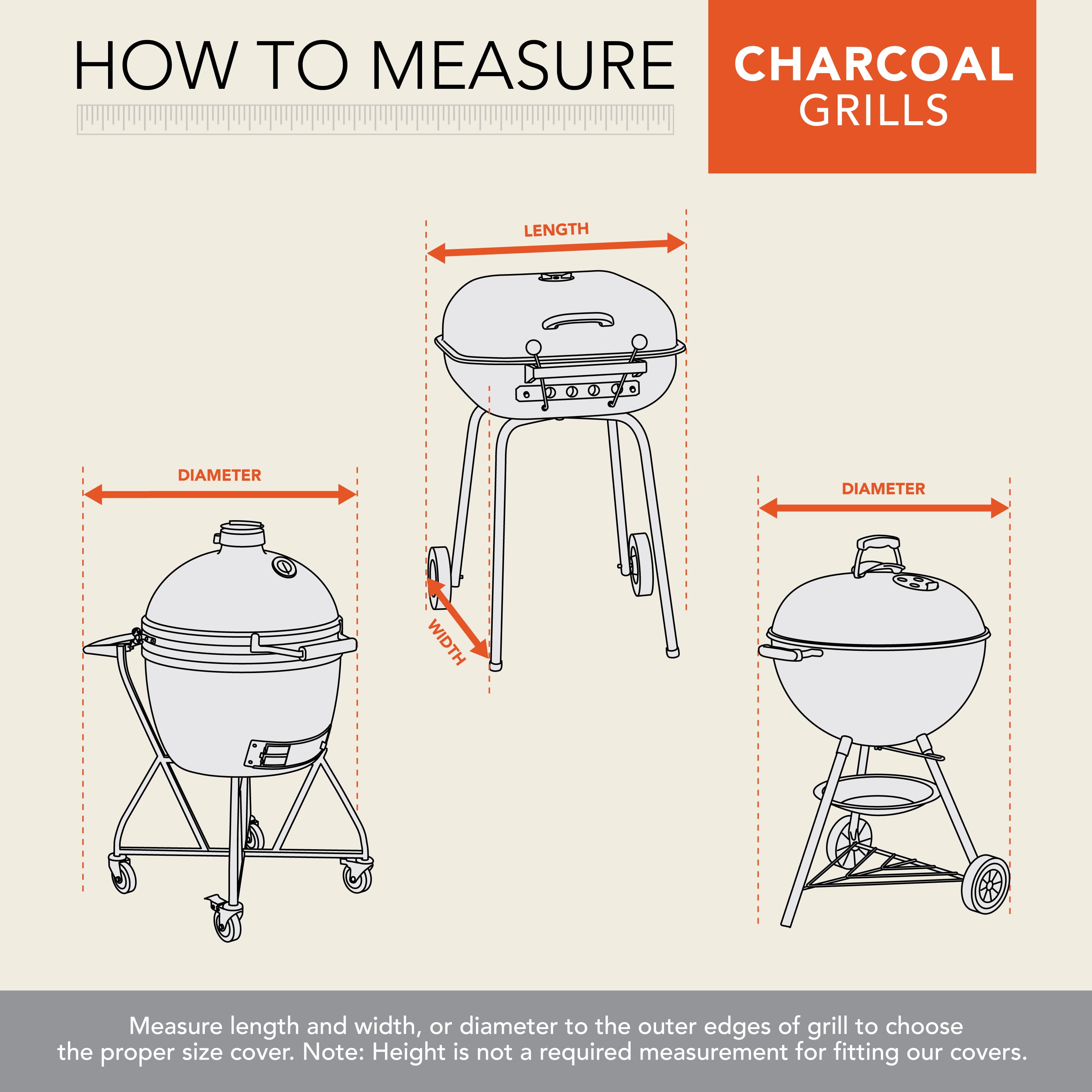 - Charcoal Grill Cover: Fits most walk-a-bout charcoal grills up to 21.5-inches long x 21.5-inches wide x 14.5-inches high.