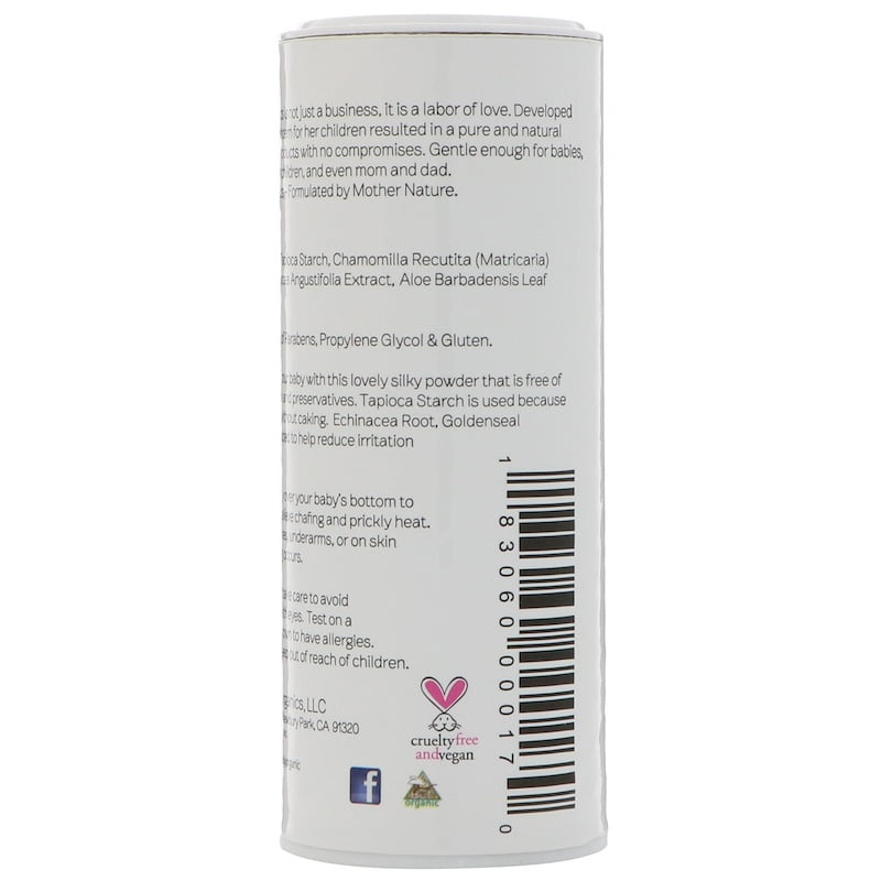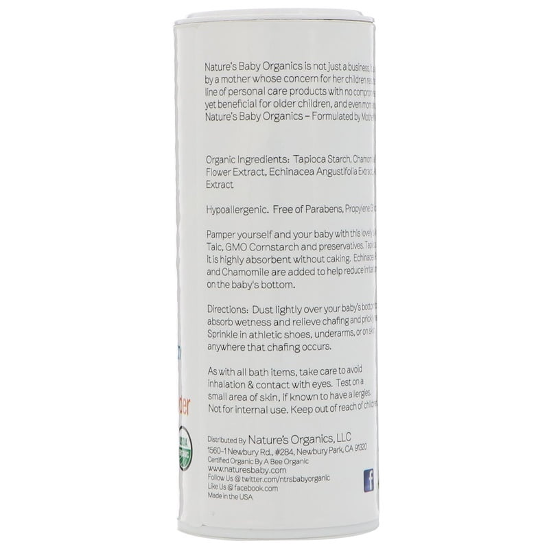 Nature’s Baby Organics is not just a business, it is a labor of love, developed by a mother whose concern for her children resulted in a pure and natural line of personal care products with no compromises. Gentle enough for babies, yet beneficial for older children, and even mom and dad.Pamper yourself and your baby with this lovely silky powder that is free of Talc, GMO Cornstarch and preservatives. Tapioca Starch is used because it is highly absorbent without caking. Echinacea Root, Goldenseal and Chamomile are added to help reduce irritation on the baby’s bottom.