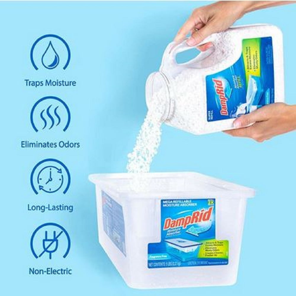 DampRid Mega moisture absorber refill twist cap jug allows refill material to be poured like a liquid. Moisture absorbing crystals effectively absorb the excess moisture in your closets, recreational vehicles, basements and more. Highlights: Size: 7.5 Lbs Scent: No Odorless: Yes Attracts and traps excess moisture Eliminates musty odors Mega Refill Eliminates musty odors caused by excess moisture Lasts up to 6 months Prevents stains, damage and odors caused by moisture Use With Model # FG280 Packaging Type: Tub
