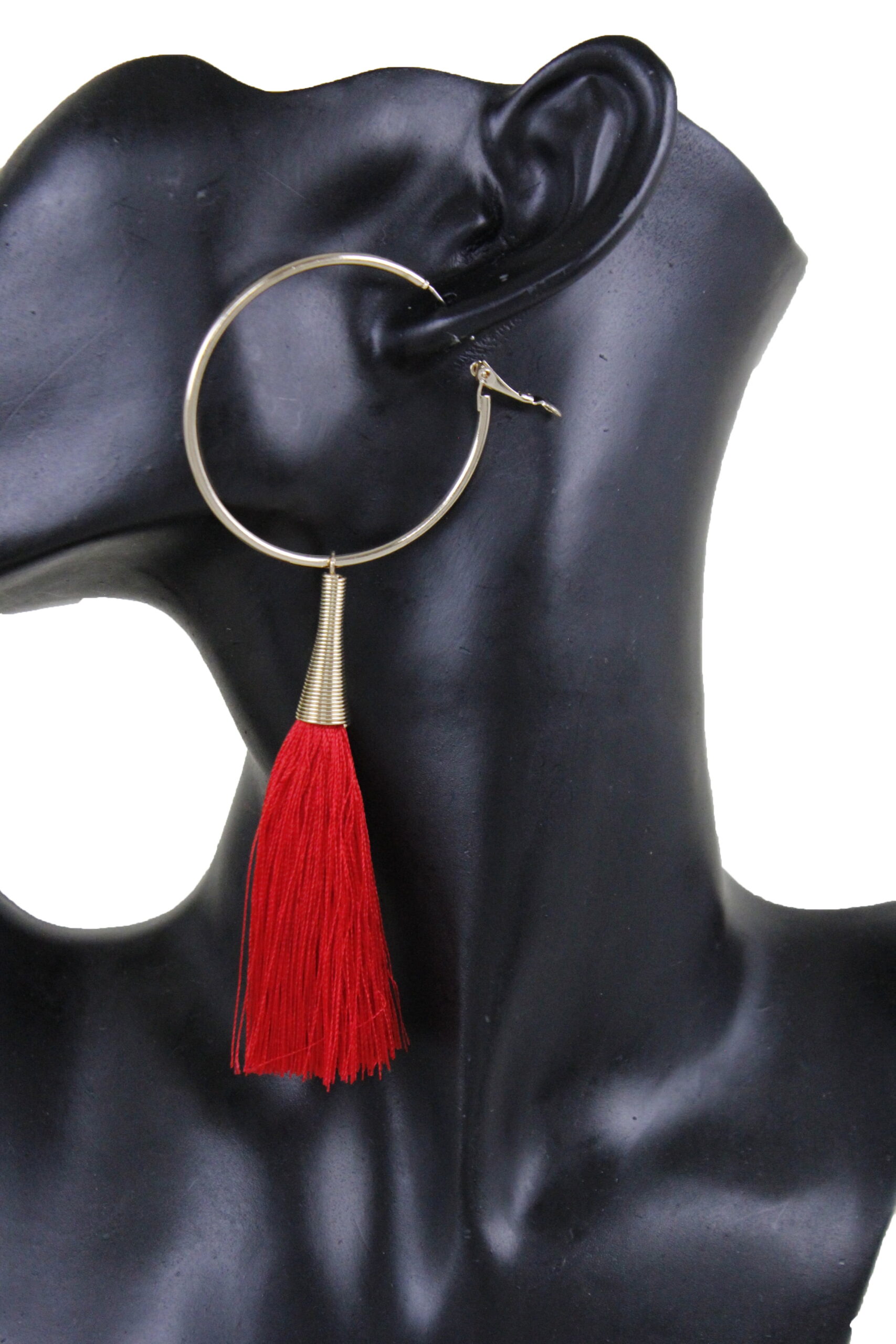 New Women Gold Metal Hoop Red Fabric Tassel Hook Earring Set