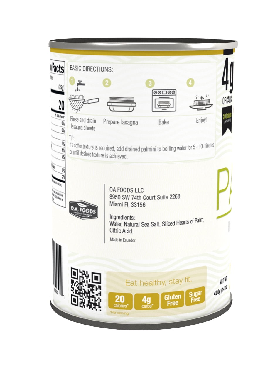 Palmini is a low carb pasta substitute made 100% out of a natural plant known as Hearts of Palm. When this plant is cut and cooked in the proper way, it’s resemblance to regular lasagna is remarkable. Not only does it look like pasta, but it can also taste like pasta if you add the proper sauce and ingredients! Palmini is a pasta substitute made out of a natural plant known as hearts of palm. When this plant is cut and cooked in the proper way, its resemblance to regular pasta is remarkable. Palmini is made from cultivated hearts of palm and harvested in an environmentally sustainable way. Made in Ecuador.