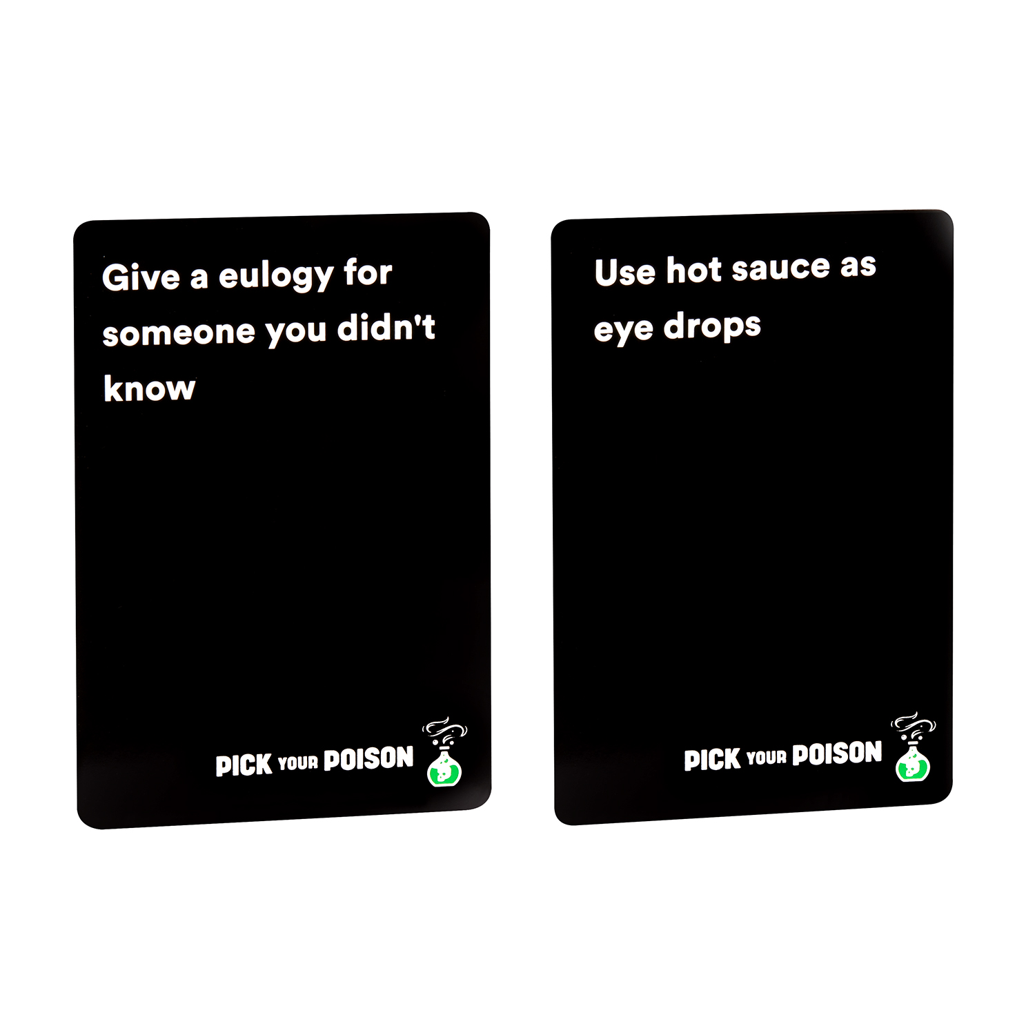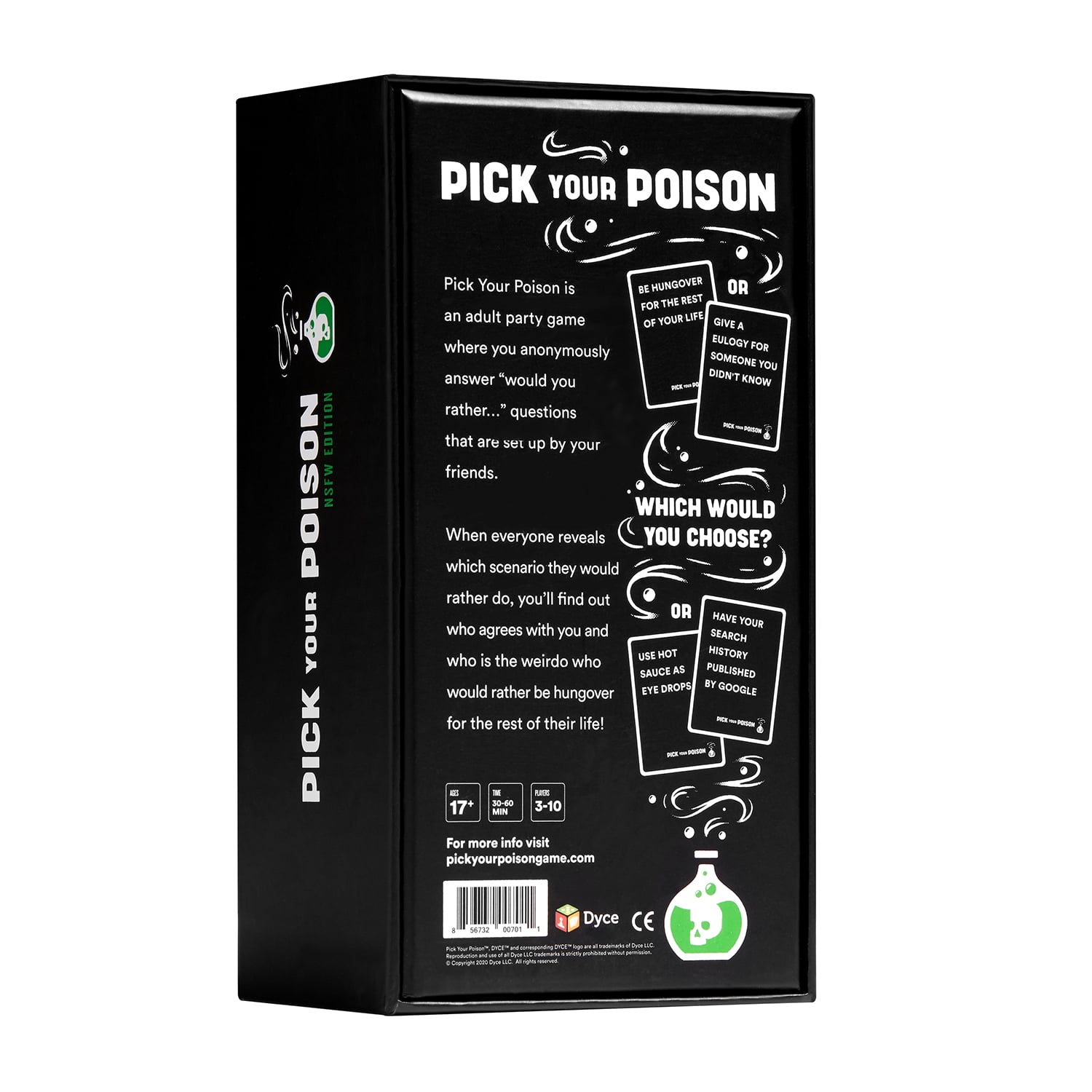 – Pick Your Poison is a card game of unfathomable “What would you rather do?” scenarios. – Three or more players compete to create the hardest scenario possible by combining two Poison cards (300 included). – Everyone anonymously "Picks their poison" – After the reveal, find out who was "right" and who is just as messed up as you thought. – From the creators of The Voting Game and Hot Seat. – Combine with the Regular Edition for even more fun!