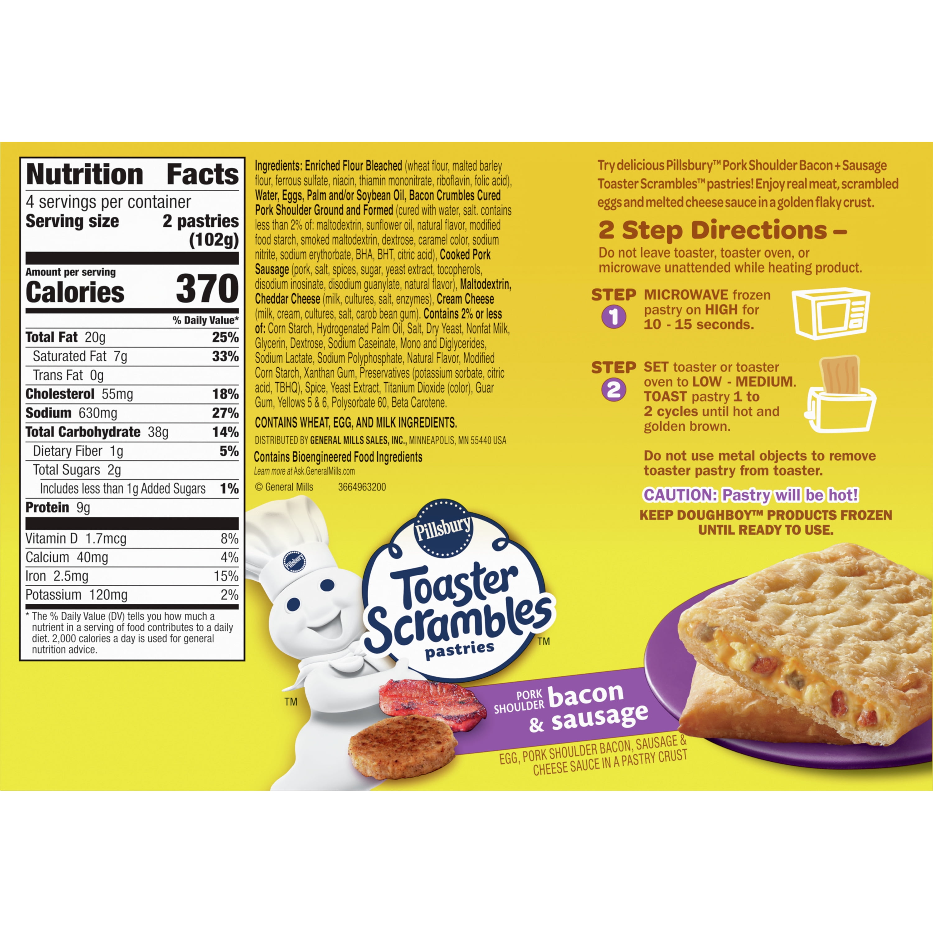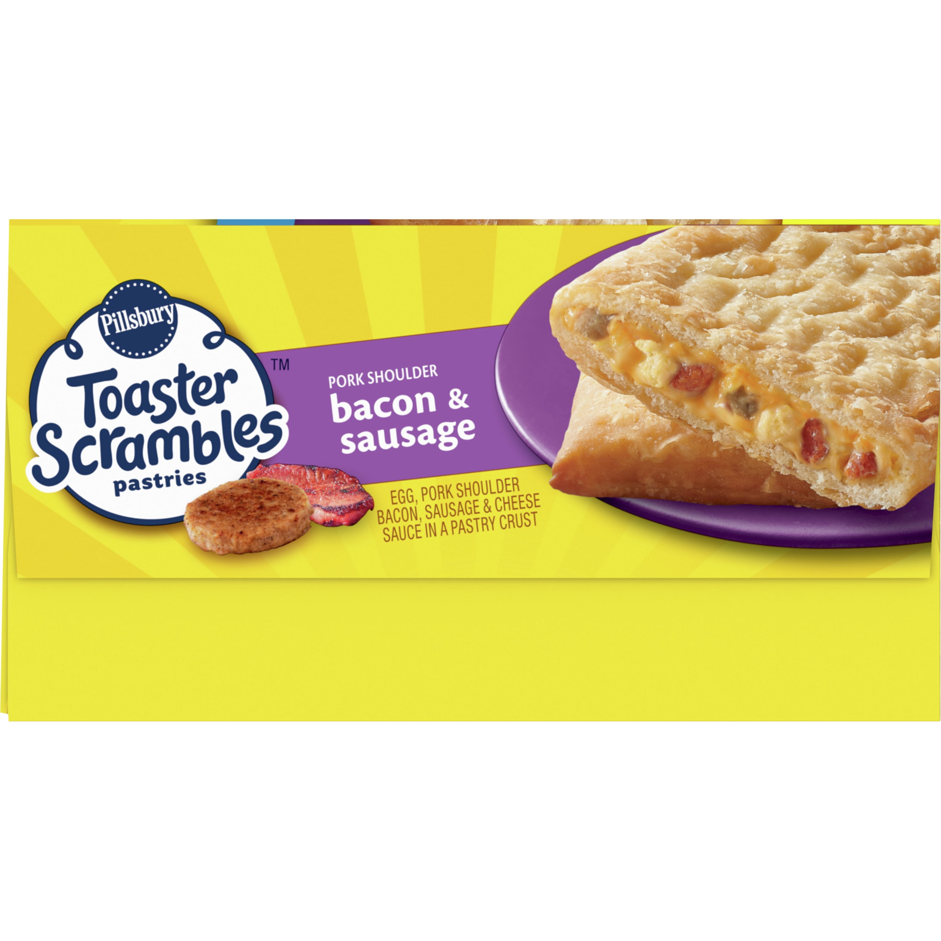 - TOASTER SCRAMBLES: A savory breakfast option made with bacon; sausage; cheese sauce and scrambled eggs in a pastry crust
