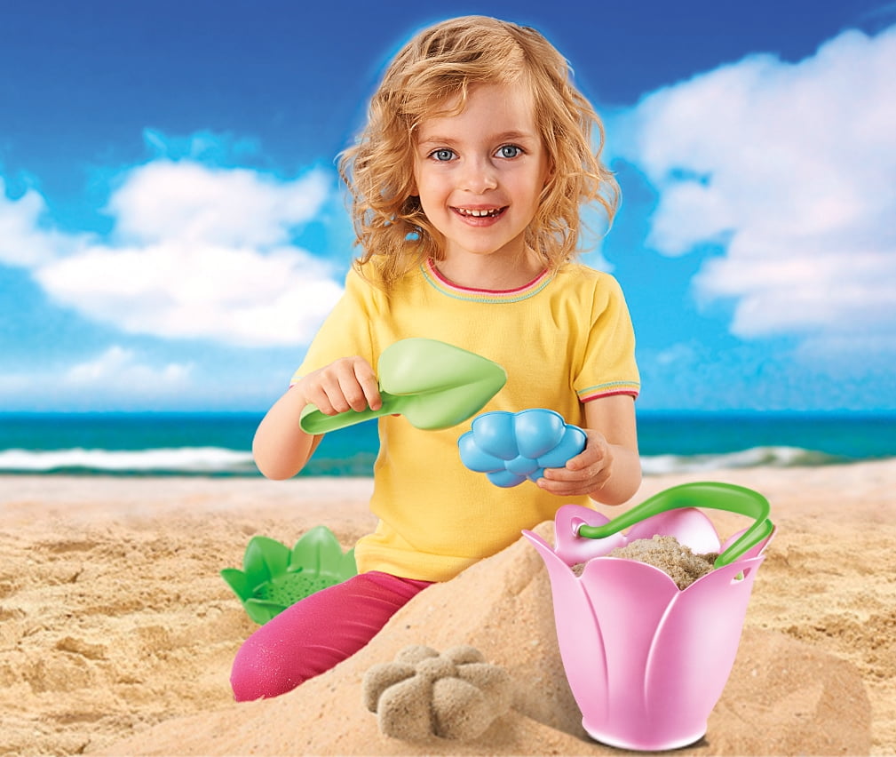 Dig in at the beach with Spring Flower Bucket! Use the leaf shovel to scoop up the sand and then pour over the sieve to separate out any seashells. Kids can then use the collected sand to fill the flower mold. Or, fill the bucket with water and then watch the pretty pink flower float! Set includes one figure, flower bucket with handle, sieve, leaf shovel, and flower mold. Dimensions: 8 x 7.5 x 7 in (LxWxH). Recommended for ages two years and up.