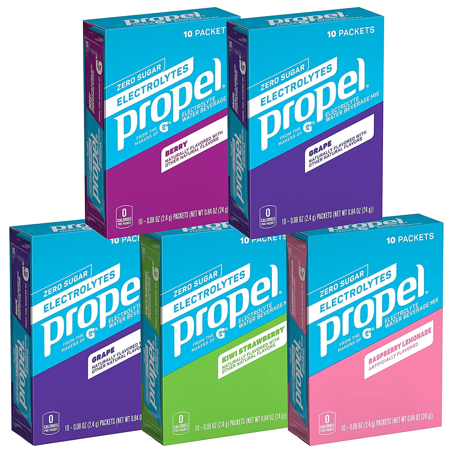 Contains five (5) 10-count boxes of Propel Powder Packets Raspberry Lemonade (1), Berry (1), Grape (2), Kiwi Strawberry (1) with Electrolytes, Vitamins and No SugarPropel Powder Packets 4 Flavor Variety Pack With Electrolytes, Vitamins and No Sugar 10 Count (Pack of 5) (Packaging May Vary)