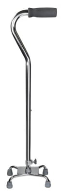 Manufacturer #146- 10301F-4 Brand McKesson Manufacturer Drive Medical – McKesson Application Quad Cane Color Chrome Handle Specifications Offset Padded Handle Height 30 To 39 Inch Material Aluminum Maximum Patient Weight 300 lbs. UNSPSC Code42211501 Latex Free Indicator Not Made with Natural Rubber Latex Features The McKesson Small Base Quad Cane manufactured by Drive Medical is for stand-alone capability for convenience when not in use easily balances without requiring surface to lean on and does not require user to bend to pick up from the floor. Quad-cane style for more stability compared to standard canes Small base to balance the maneuverability of a standard-style cane and the stability of a large-base cane Easy-to-use, single push button with locking bolt quickly and securely adjusts height from 30 to 39 inches. Manufactured with aluminum construction for lasting support. No assembly required. Sleek, chrome finish. Actual product may vary from image. See product specifications for more detailed information. Packaged: 1 Each.Quad Cane, Chrome Finish, Adjustable 30" to 39", Small Base, Aluminum