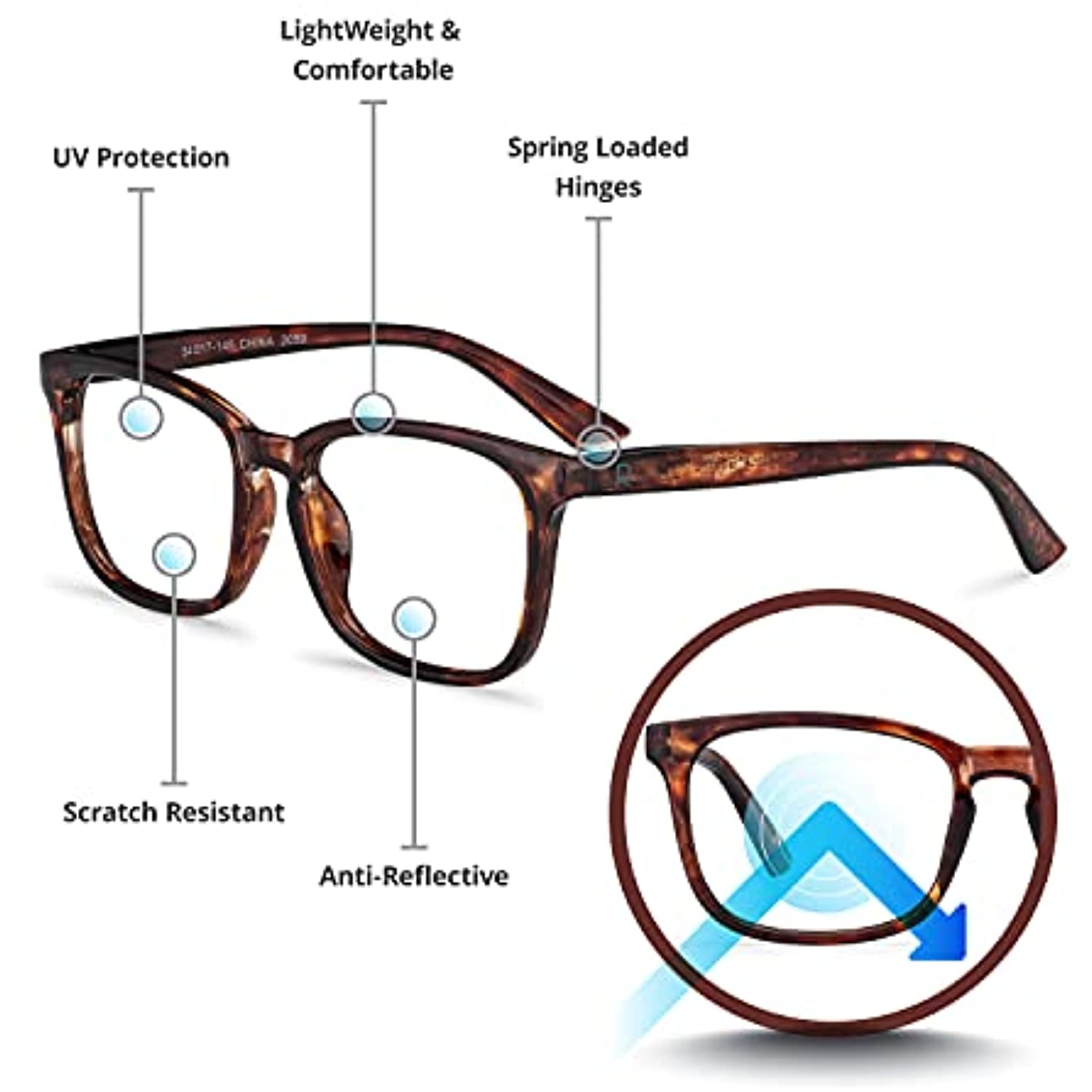 - SPRING HINGES LIGHT WEIGHT. All glasses are equipped with 100 spring loaded hinges. This ensures that they will not bend over time on larger faces. Combined with our lightweight frames, these glasses are comfortable with a capital C! Gone are the days of heavy frames adding pressure to your temples and bridge of your nose.