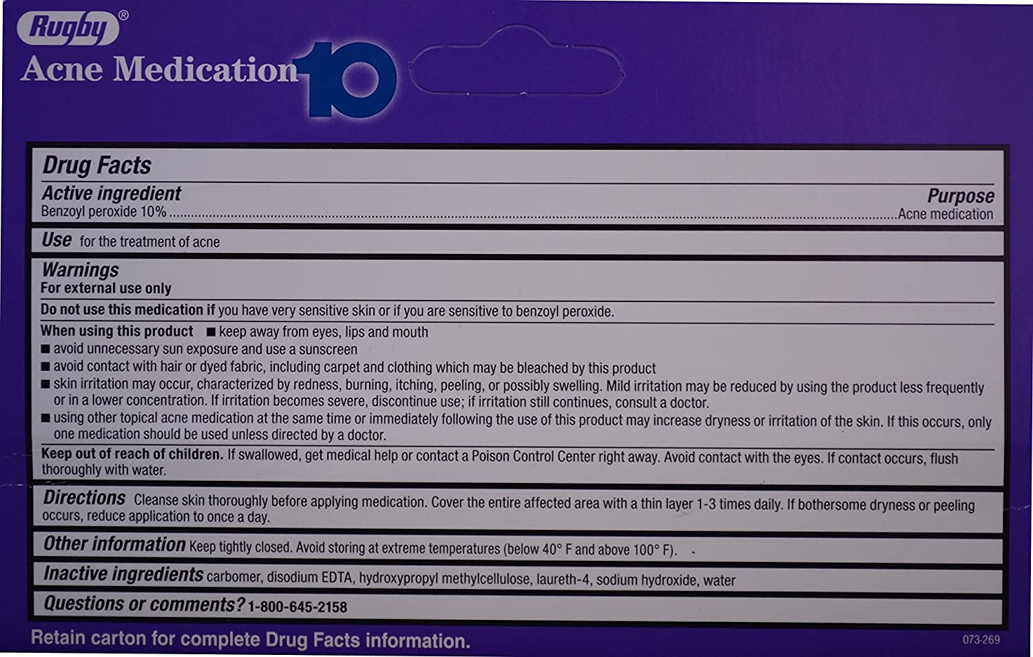 Rugby Benzoyl Peroxide Acne Medication Gel 10%, 1.5 Oz.