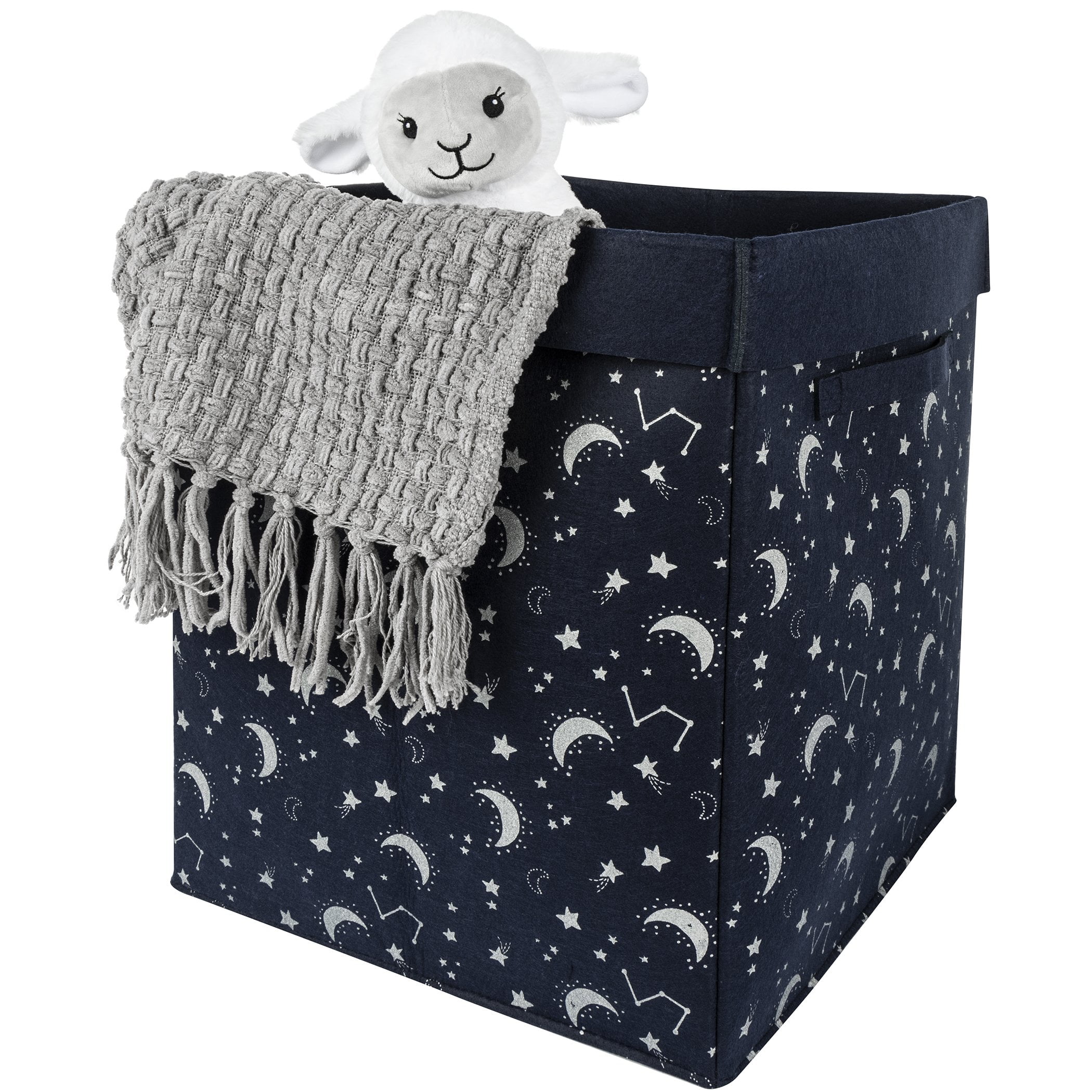 This Sammy & Lou Constellation Felt Bin with a fold over top is a great storage essential. Perfect for holding toys, gear, blankets, clothes or just keeping clutter out of sight. Featuring a navy finished, folded edge and a silver-white galaxy print exterior, the hamper has spacious storage capacity with a large opening and roomy interior. Coordinating accessories and room decor by Sammy & Lou are available and sold separately.